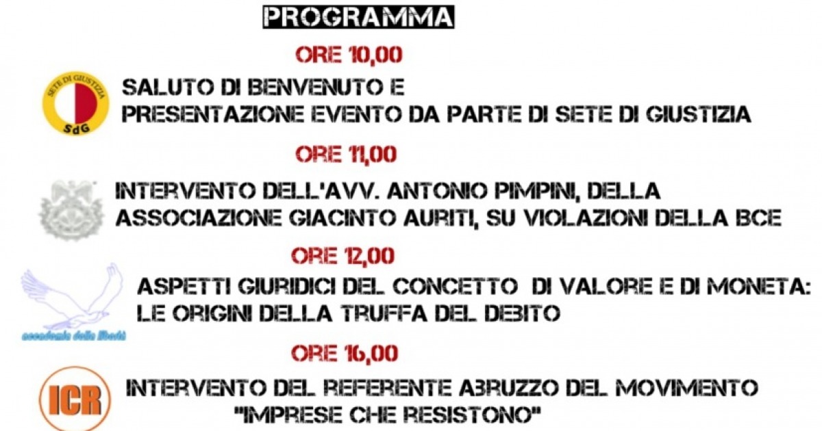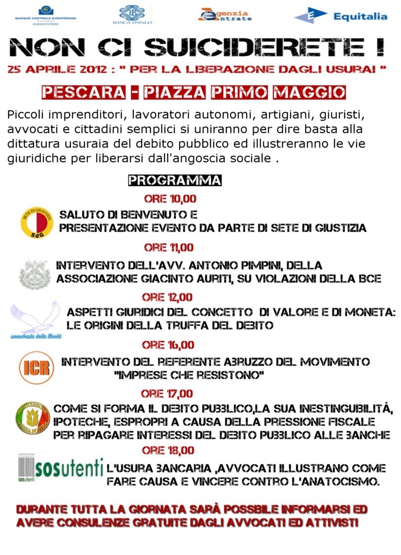 LA MANIFESTAZIONE - Il 25 aprile si sarà a Pescara la manifestazione nazionale "Per la Liberazione dagli usurai di Stato". Ad organizzarla non sono movimenti politici ma associazioni di piccoli imprenditori, lavoratori autonomi e cittadini che vivono nell'angoscia da insolvenza nei confronti dello Stato, di Equitalia e delle banche. La manifestazione è stata organizzata alla luce dei recenti fatti di cronaca per i suicidi da insolvenza ed incapacità di far fronte all'elevata pressione fiscale che chiede il sacrificio per il risarcimento degli interessi sul debito pubblico.