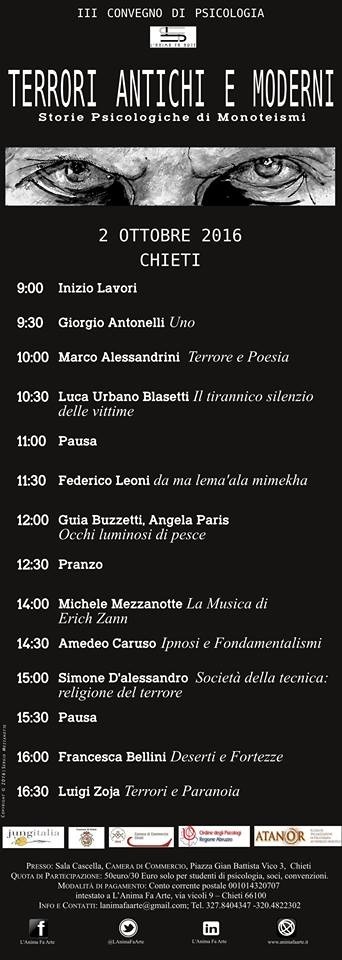 TERRORI ANTICHI E MODERNI. STORIE PSICOLOGICHE DI MONOTEISMI. Il tema del terrore e del terrorismo ha una forte attualità e rilevanza nella nostra contemporaneità. Sarà un convegno di psicoanalisi, filosofia e sociologia dove saranno presenti ospiti internazionali tra cui: Luigi Zoja(psicoanalista spesso presente in trasmissioni RAI e i cui libri sono stati tradotti in 14 lingue diverse nel mondo), Giorgio Antonelli (psicoanalista, autore di moltissime pubblicazioni, è stato presidente del centro studi fondato da Aldo Carotenuto), Amedeo Caruso (allievo di Aldo Carotenuto, autore di numerose pubblicazioni relative alla psicoanalisi e al cinema), Angela Paris (consigliera dell'Ordine degli psicologi abruzzesi e presidente della scuola di psicoterapia Atanor), Marco Alessandrini (direttore C.S.M. Chieti-Ortona e del reparto di riabilitazione psichiatrica di Guardiagrele) e altri. Inoltre verrà presentata un'intervista inedita sul Terrorismo da noi condotta a Noam Chomsky, uno dei più grandi intellettuali della storia, linguista, filosofo e ricercatore americano.