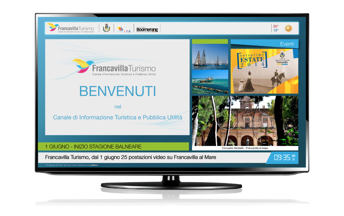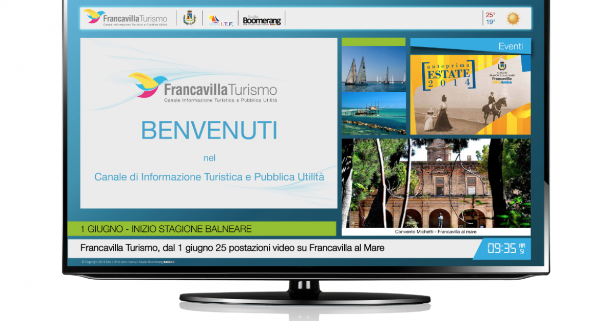 DIFFUSIONE. Oltre 20.000 utenti giornalieriAttualmente Francavilla Turismo conta 25 postazioni tv: 1 postazione IAT Piazza Sirena, 1 postazione IAT Piazza Asterope, 2 postazioni Hotel (Francavilla Hotels), 2 postazioni Bar, 20 postazioni Stabilimenti balneari (Associazione ITF). Le tv saranno posizionate in luoghi strategici e ben visibili. Il progetto sarà operativo dal 1° giugno al 31 agosto, dalle 9.00 alle 22.00 .