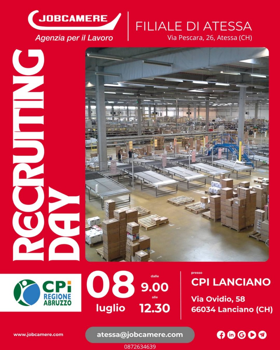 Il recruiting day è organizzato dal Centro per l’impiego di Lanciano per l’8 luglio 2024 dalle ore 9 alle ore 12:30 per la ricerca di figure specializzate da inserire in aziende locali.