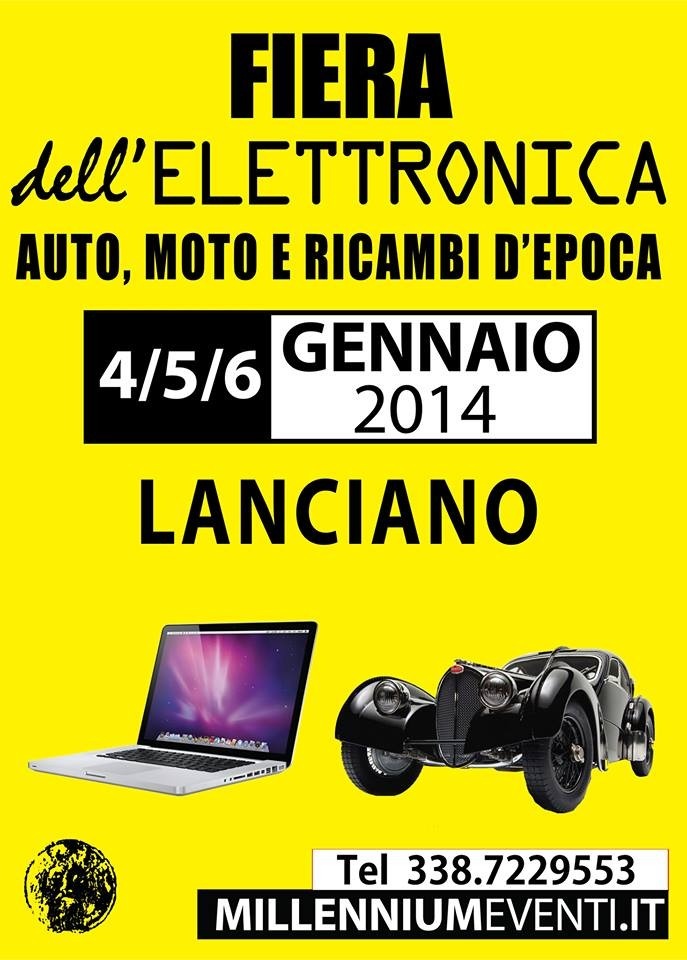 Torna, a Lancianofiera, la Fiera dell’elettronica e auto-moto-ricambi d’epoca. L’evento si è consolidato nel corso degli anni come uno degli appuntamenti fieristici più importanti della regione Abruzzo con una media di 7mila presenze per ogni edizione. Per la prima volta la manifestazione si svolgerà, in questa 4a edizione, in tre giornate: da sabato 4 a lunedì 6 gennaio 2014. In rassegna, oltre al nutrito Mercato di Elettronica, la III Mostra scambio di auto, moto e ricambi d'Epoca.