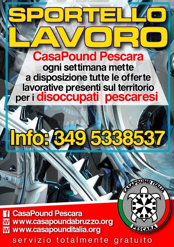 CASAPOUND AIUTA A TROVARE LAVORO. Un servizio gratuito per favorire l'inserimento di persone in cerca di occupazione nel mondo del lavoro, attraverso una raccolta di curricula e un continuo e attento monitoraggio delle offerte lavorative. È questa la nuova iniziativa inaugurata a Pescara da CasaPound Italia, allo scopo di fornire assistenza a quanti cercano lavoro.