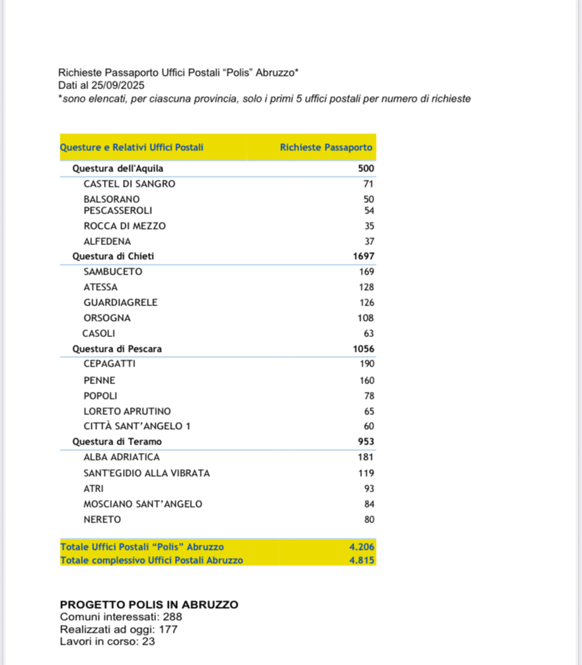 I record abruzzesi. Complessivamente, negli uffici postali abruzzesi sono state registrate 4.815 richieste di passaporto (dato aggiornato al 25/09/2025). Di queste, 4.206 provengono dai 288 uffici postali di altrettanti comuni con popolazione inferiore ai 15mila abitanti coinvolti nel progetto Polis, mentre le restanti 609 arrivano dai 37 uffici postali delle città di Pescara (295), Chieti (173) e Teramo(141), dove il servizio è stato attivato a dicembre 2024. L’iniziativa, infatti, prevede il progressivo ampliamento del servizio di richiesta passaporti anche negli uffici postali di L’Aquila e degli altri comuni abruzzesi con popolazione superiore ai 15mila abitanti.