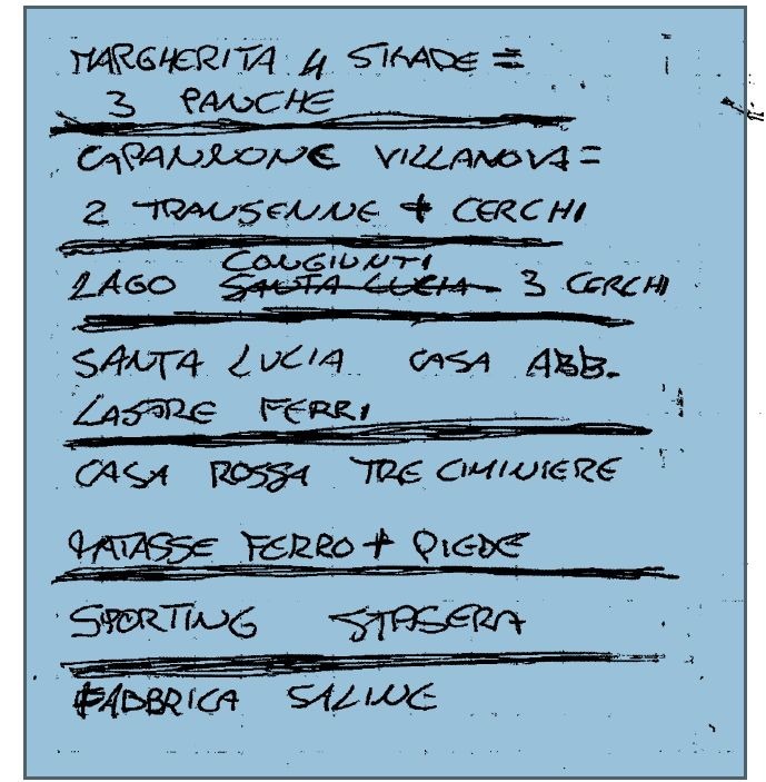 LA PERQUISIZIONE: IL PIZZINO - In seguito alla perquisizione personale è spuntato il pizzino con gli appunti degli obiettivi da colpire. Una mappa dettagliata con l’indicazione dei prossimi furti da compiere, la località e tipo di materiale da asportare: una vera e propria lista della spesa. Questo rinvenimento fa assumere all’operazione di polizia una valenza ancora maggiore perché ha consentito di sventare numerosi altri furti.