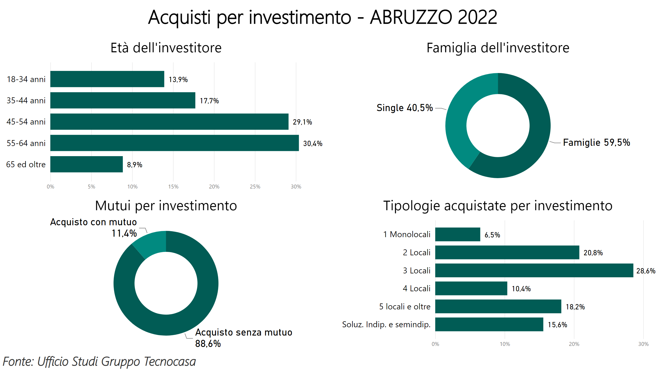 Analizzando le caratteristiche e le scelte di chi ha investito in Abruzzo si registra che la fascia di età più attiva su questo segmento di mercato è quella compresa tra 55 e 64 anni (30,4%) e nel 59,5% dei casi si tratta di famiglie. La tipologia più acquistata per investimento è il trilocale con il 28,6% delle scelte, seguito dai bilocali con il 20,8% delle preferenze. In Abruzzo l’88,6% di chi acquista per investimento lo fa in contanti, mentre solo l’11,4% delle compravendite avviene grazie all’ausilio di un mutuo bancario.