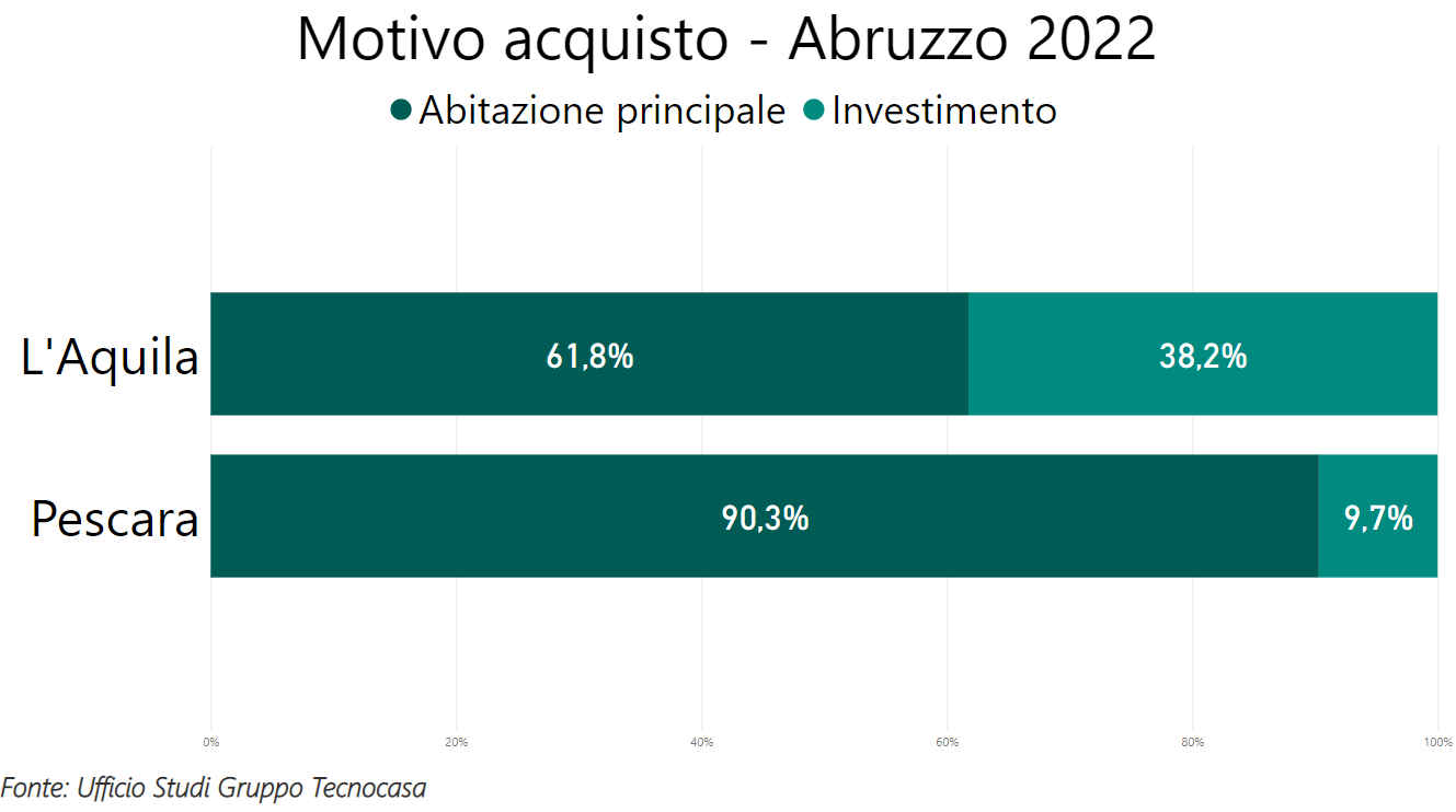 L’analisi dei capoluoghi abruzzesi evidenzia come sia L’Aquila la città con il più alto tasso di acquisti per investimento (38,2%). Si tratta di una percentuale in crescita rispetto al 2021, mentre a Pescara la componente investitori è in calo e si attesta sul 9,7%.