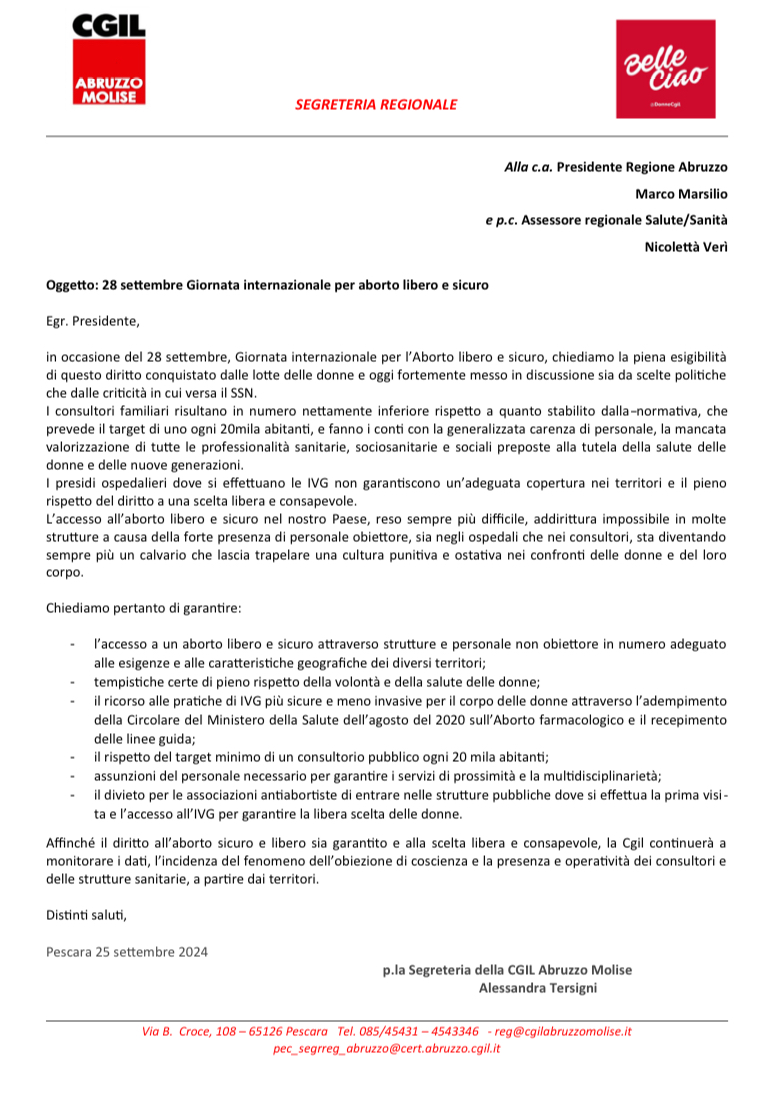 In occasione della Giornata internazionale per l’aborto libero e sicuro, la Cgil Abruzzo e Molise ha inviato una lettera al Presidente della Regione Abruzzo Marco Marsilio per rivendicare politiche sanitarie che permettano alle donne di interrompere una gravidanza in modo sicuro e sereno.
