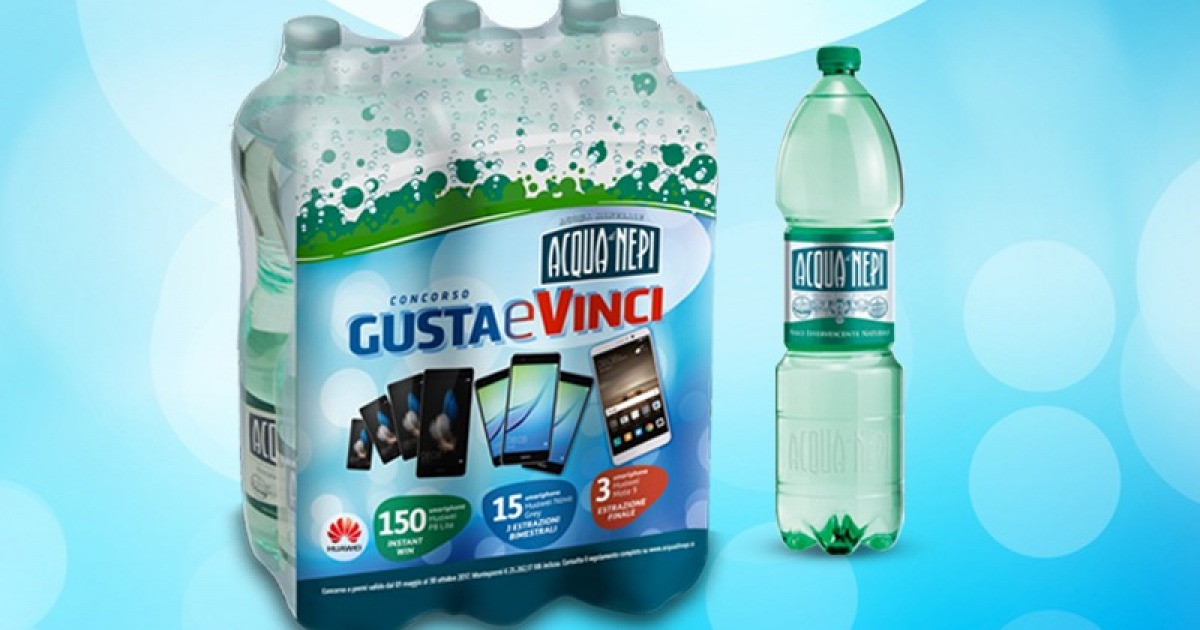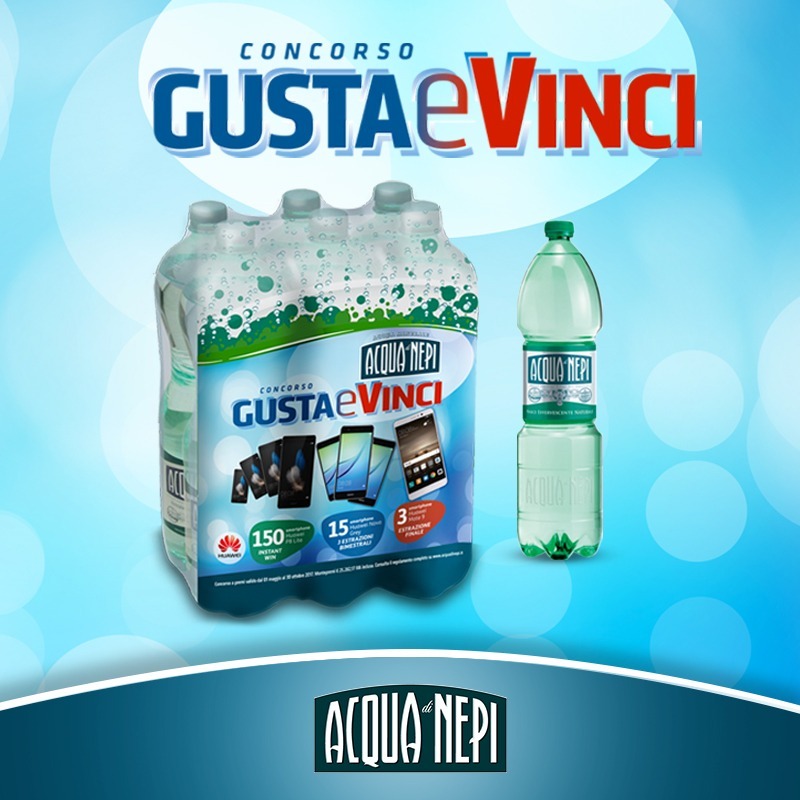 ACQUA DI NEPI PREMIA I SUOI CONSUMATORI CON IL GRANDE CONCORSO "GUSTA E VINCI". Acqua di Nepi lancia il suo nuovo concorso Gusta e Vinci. Dal 1 maggio al 30 ottobre 2017 tutti coloro che acquisteranno almeno una confezione da 6 bottiglie in plastica da 1.5L di Acqua di Nepi nell’apposito pack promozionale, avranno la possibilità di partecipare all’estrazione di tantissimi smarphone: il meglio di HUAWEI.