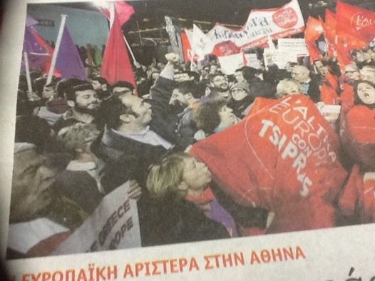 MAURIZIO ACERBO FINISCE IN PRIMA PAGINA (IN GRECIA). Maurizio Acerbo, già candidato governatore con la lista Un Altro Abruzzo - Rifondazione Comunista, ma non eletto alle ultime elezioni regionali, è finito sulla seconda pagina del quotidiano di Syriza con una foto che lo ritrae col pugno alzato mentre festeggia in Piazza Omonia ad Atene.