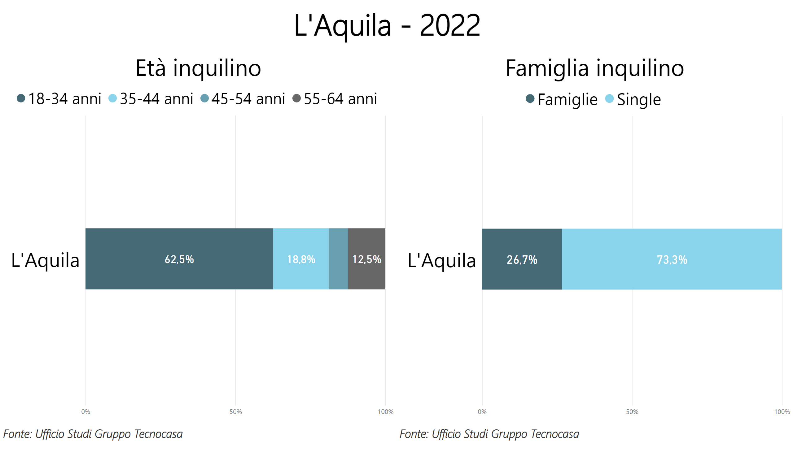 A L’Aquila la maggioranza degli inquilini ha un’età compresa tra 18 e 34 anni (62,5%) ed il 73,3% degli inquilini è single.
