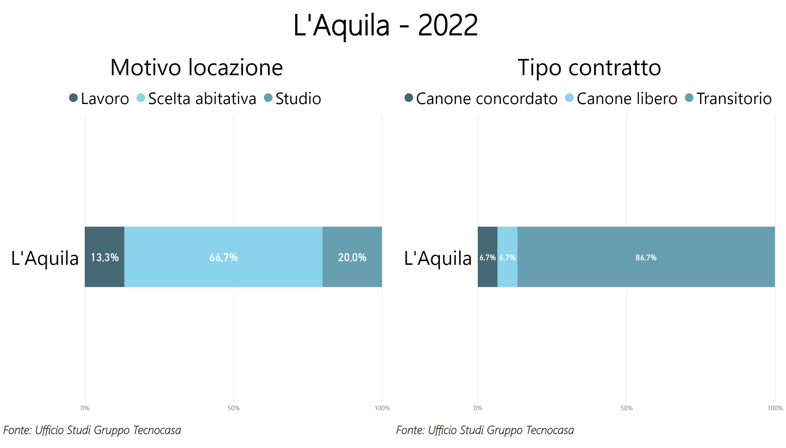 Anche a L’Aquila la maggior parte dei contratti stipulati nel2022 riguarda coloro che hanno fatto una scelta abitativa (66,7%), a seguire gli studenti con il 20,0% degli affitti. Il contratto più utilizzato è quello a carattere transitorio (86,7%).
