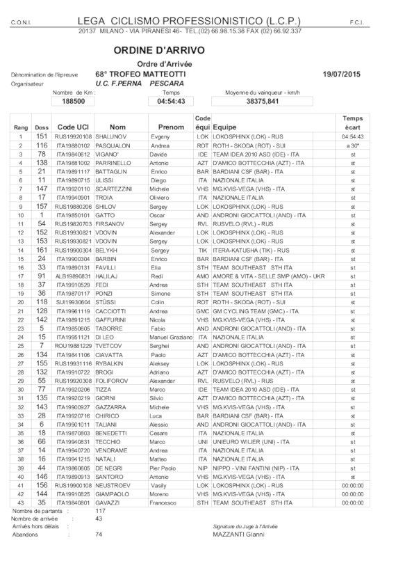 IL TROFEO MATTEOTTI VA AL RUSSO SHALUNOV. E' il ciclista russo del team Loosphinx Evgeny Shalunov ad aggiudicarsi per distacco il 68/o Trofeo Matteotti di ciclismo, corso sul circuito cittadino di Pescara in una giornata caldissima. Al traguardo di piazza Duca degli Abruzzi Shalunov ha preceduto Andrea Pasqualon della Roth-Skoda e Davide Viganó del Team Idea 2000. Il vincitore ha chiuso la gara alla media di 38,375 km/h, con tempo di 4 ore 54 minuti 43 secondi. Oggi a Pescara anche il commissario tecnico della Nazionale Italiana Davide Cassani.