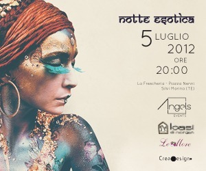 SILVI. NOTTE ESOTICA - Angels Events di Adriana Melissano, il 19 luglio, proverà a sdrammatizzare il clima ostile e caldo di questo periodo proponendo una "Notte esotica". Si tratta di una serata dalla forte impronta caratteristica, dal gusto selvaggio e sensuale dove divertimento e libertà sono assicurati presso lo stabilimento balneare "Oasi di Morgan", in Piazza Nenni a Silvi Marina.