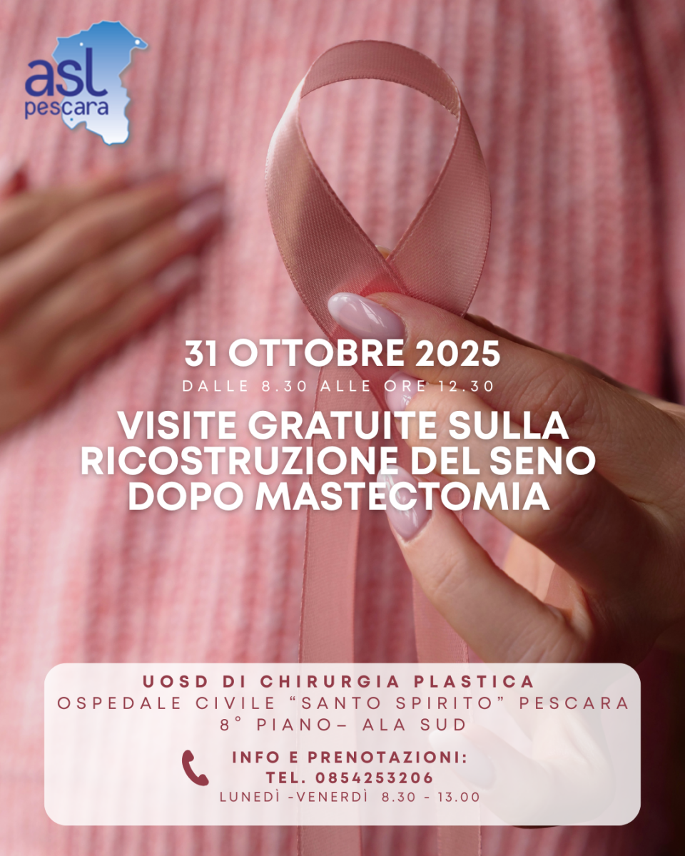 In occasione della giornata internazionale BRA Day – Breast Reconstruction Awareness Day, dedicata alla consapevolezza sulla ricostruzione mammaria dopo mastectomia, la ASL di Pescara organizza giovedì 31 ottobre 2025 un open day gratuito rivolto alle donne che hanno affrontato o stanno affrontando un percorso di cura per il tumore della mammella, con necessità legate agli aspetti ricostruttivi.