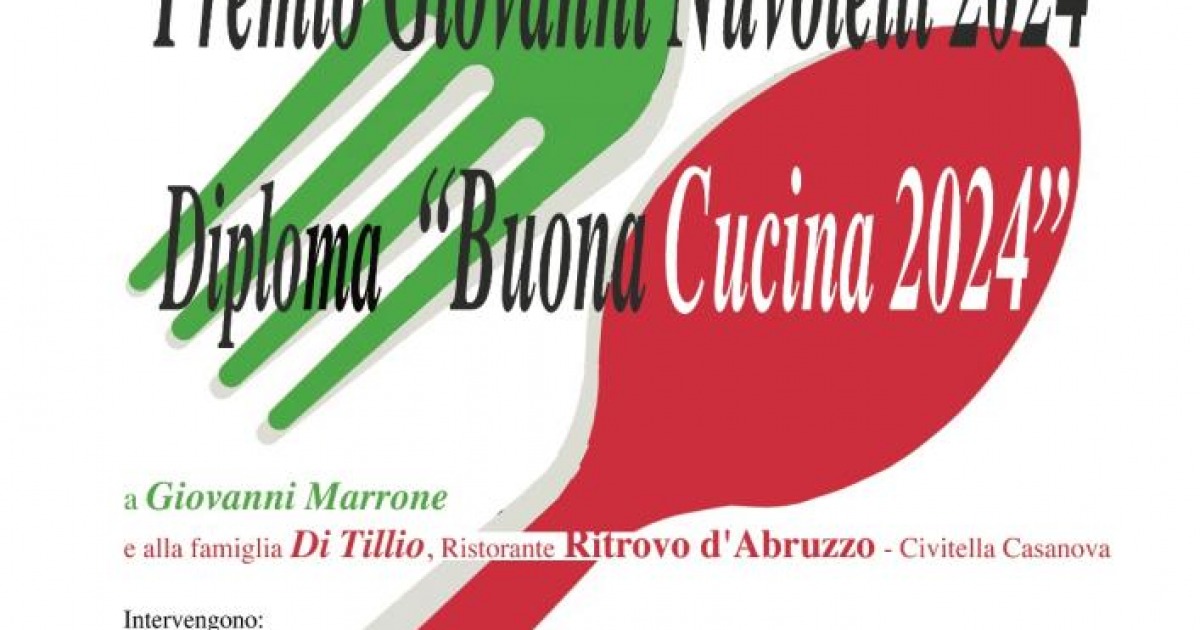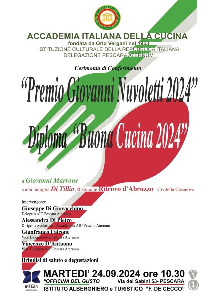 Consegnati il Premio “Giovanni Nuvoletti 2024” al noto gastronomo abruzzese Giovanni Marrone, ex titolare del ristorante Taverna 58, e il Diploma di “Buona Cucina 2024” al Ristorante Ritrovo d’Abruzzo di Civitella Casanova. Sono intervenuti la Dirigente Scolastica Alessandra Di Pietro, i vice delegati dell’Accademia Gianfranco Falcone e Vincenzo D’Antuono, il Vice Presidente vicario nazionale dell’Accademia Mimmo D’Alessio.