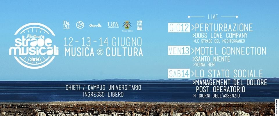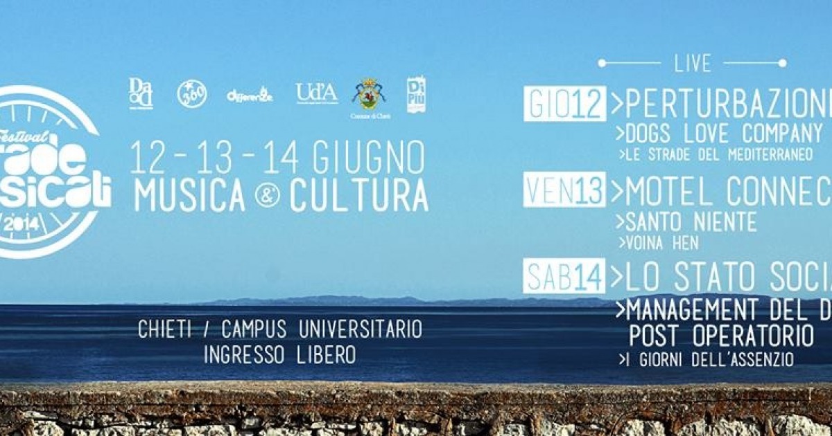 PROGRAMMA COMPLETO. MARTEDI 10. Ore 21.00 Auditorium del Rettorato dell’Università “G. d’Annunzio” di Chieti “L’ONDA”, spettacolo teatrale di fine laboratorio con gli studenti dell’Università “G. d’Annunzio” a cura di Vincenzo Giordano. GIOVEDI 12. Ore 11.00 Presentazione della web serie “Avvocato di strada”, finalista al concorso “Are You Series” del Milano Film Festival. Sarà presente il cast della serie. Ore 20.30 Premiazione dei vincitori del concorso fotografico “Strade”. Ore 21.00 inizio concerti: Le Strade del Mediterraneo, Dogs Love Company, Perturbazione. VENERDI 13. Ore 11.00 lezione aperta – “Incroci: cinema, giornalismo, teatro, letteratura” Interverranno: Prof. Carmine Di Ilio (Rettore dell’Università degli Studi “G. d’Annunzio” di Chieti – Pescara), Luciano Odorisio (regista e sceneggiatore), Mauro Tedeschini (Direttore de Il Centro), Milo Vallone (regista e attore). Introduce: Anastasio Karonis (Direttore artistico Strade Musicali 2014) Modera: Chiara Scarlato (Direttore di produzione Strade Musicali 2014). Ore 21.00 inizio concerti: Voina Hen, Santo Niente, Motel Connection. SABATO 14. Ore 21.00 inizio concerti: I Giorni dell’Assenzio, Management Del Dolore Post – Operatorio, Lo stato sociale. A seguire, Stefano D’Elia dj set;