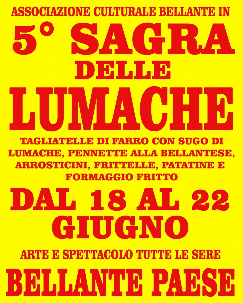 All'insegna della Lumaca in cucina, questa sagra offre l'occasione di degustare un piatto raramente disponibile nei ristoranti. Il sugo di lumache accompagnato alle Tagliatelle di Farro e le Pennette alla Bellantese, piatto tipico della zona con piselli, funghi e carne macinata.