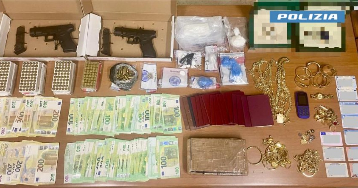 Nella stessa stanza, in un trolley, erano nascoste 2 pistole semiautomatiche calibro 9, prive di numero di matricola e pertanto considerate clandestine, oltre a 258 colpi.