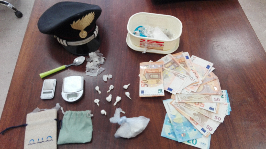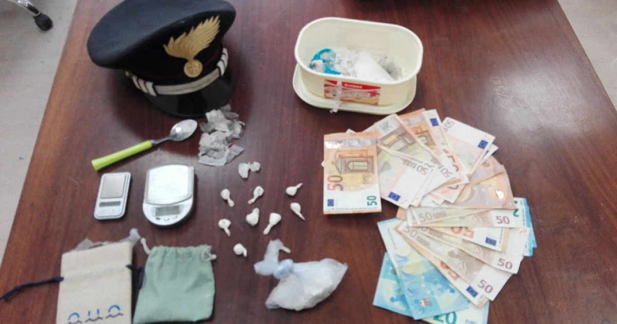 Veniva quindi eseguita una perquisizione veicolare e personale al termine della quale, all’interno dell’autovettura venivano rinvenuti 9 involucri debitamente confezionati e pronti allo spaccio, contenenti complessivamente grammi 5 di cocaina. La perquisizione veniva estesa anche all’abitazione del predetto, al termine della quale veniva rinvenuto un ulteriore involucro in carta cellophane di colore bianco, contenente complessivamente grammi 32 di cocaina, nonché due bilancini di precisione, materiale per il confezionamento e la somma contante di euro 1.025,00 ritenuta provento dell’illecita attività di spaccio, sottoposti a sequestro.