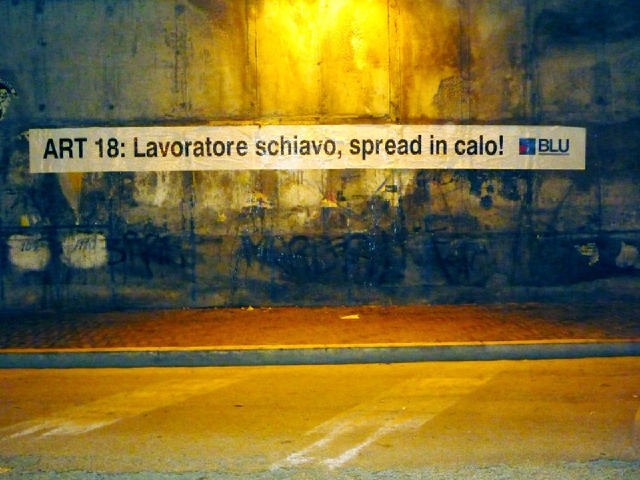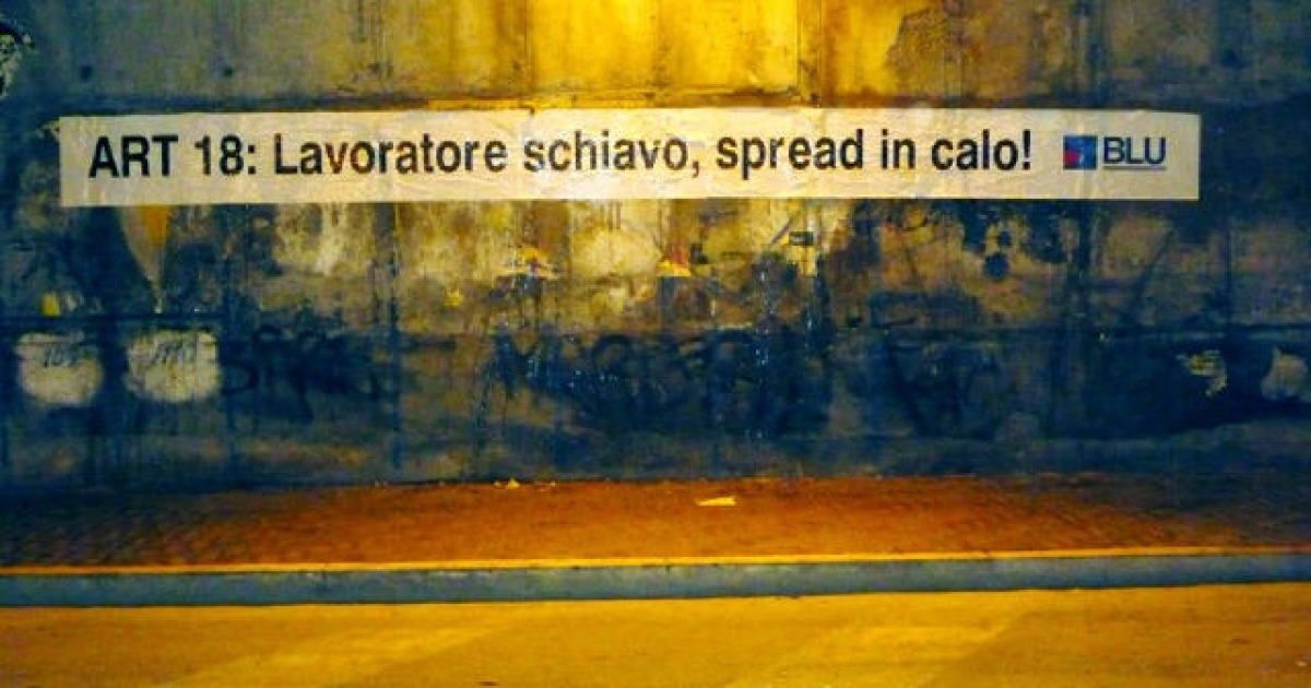LAVORATORI VS. MERCATI - «Art. 18: lavoratori licenziati, mercati deliziati», «Art. 18: lavoratori pezzenti, mercati contenti», «Art. 18: lavoratore disperato, mercato rassicurato», «Art. 18: lavoratore schiavo, spread in calo» sono i messaggi lanciati dagli striscioni, comparsi su muri, cavalcavia e davanti alle sedi di partiti, istituzioni e sindacati di città e piccoli centri dal nord al sud del paese per protestare contro una riforma che, si legge sul volantino diffuso dal sindacato, «vuole avvicinare le condizioni dei lavoratori italiani a quelle dei lavoratori del terzo mondo». Ma, secondo Blu, «peggiorare la condizione dei lavoratori non porterà nuovi investimenti in Italia e certamente non impedirà alle imprese di delocalizzare alla ricerca di lavoratori low cost». «Non saremo mai competitivi con i lavoratori del terzo mondo che lavorano per pochi euro, senza sicurezza, senza orari, senza tutele – spiega il volantino - finché non saremo schiavi anche noi». Per questo, si legge, «non crediamo alla riforma del lavoro, non crediamo che rendere più facili i licenziamenti porterà sviluppo per il paese e di conseguenza più lavoro. Il lavoro in sé non è indice di benessere: la qualità del lavoro, la sicurezza sul lavoro, la giusta retribuzione per il proprio lavoro sono benessere».
