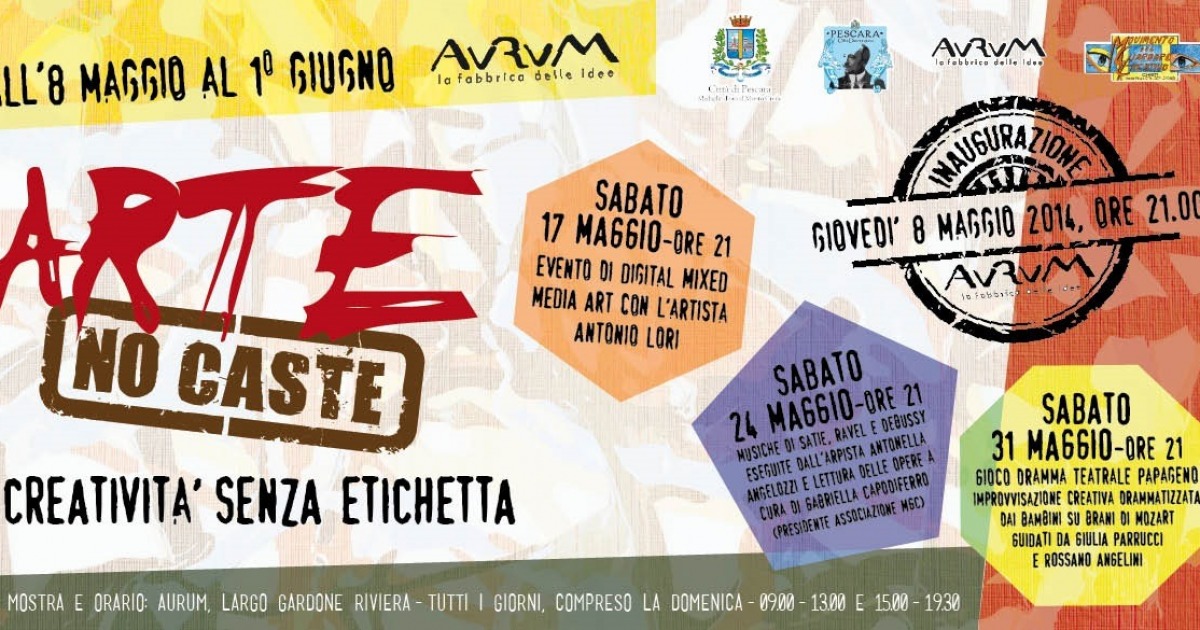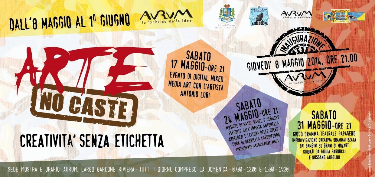 ARTE NO CASTE, KERMESSE A CURA DI CHIARA STROZZIERI. Sarà inaugurata giovedì 8 maggio 2014 alle ore 21.00 presso l'Aurum di Pescara la mostra Arte no caste, curata dal critico d'arte Chiara Strozzieri e promossa dall'associazione MGC (Movimento del Guardare Creativo), operante a Chieti dal 1987 e impegnata nell'organizzazione di laboratori artistici per adulti ed eventi culturali di interesse pubblico.
