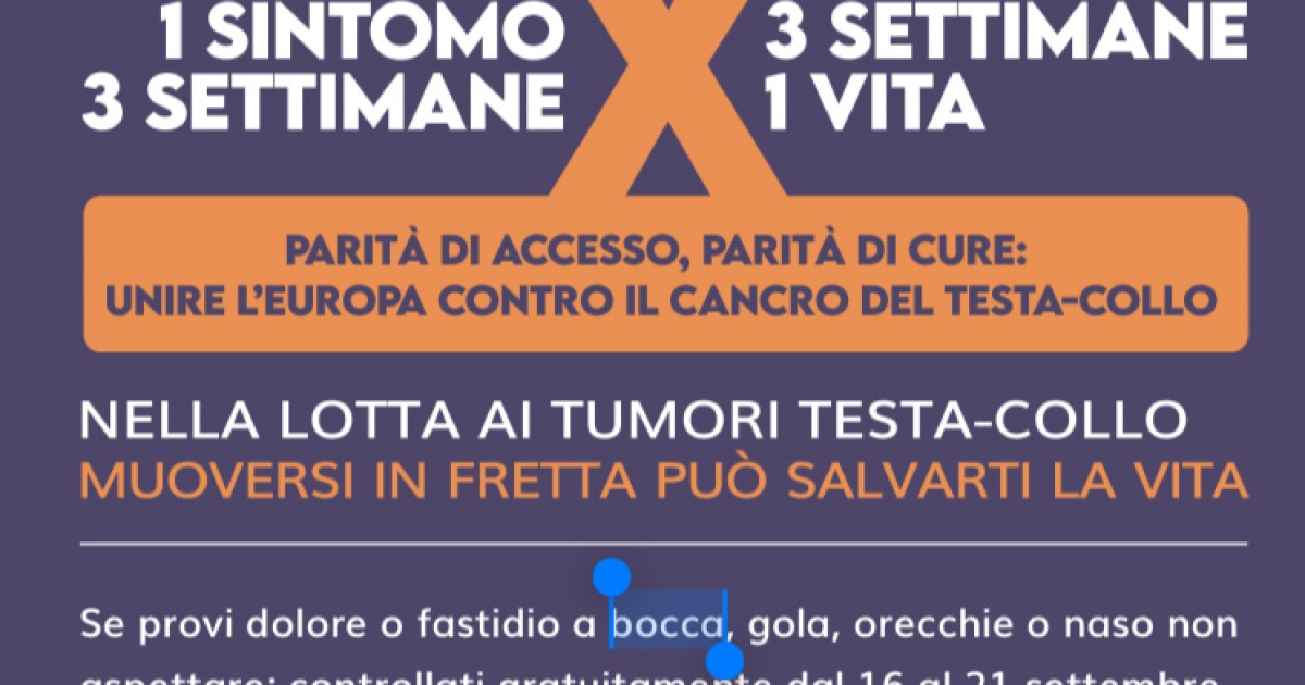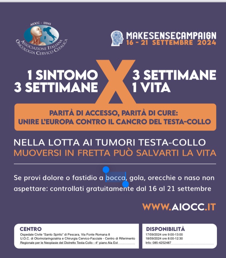 “1 sintomo per 3 settimane, 3 settimane per 1 vita” è il motto dell’edizione italiana della Make Sense Campaign 2024, la campagna europea di educazione e sensibilizzazione alla prevenzione dei tumori del distretto testa-collo che quest’anno tornerà dal 16 al 21 settembre. Promossa in Italia dall’Associazione Italiana di Oncologia Cervico-Cefalica (AIOCC), all’iniziativa aderiranno oltre 130 centri che, in quella settimana in tutta Italia, organizzeranno giornate di diagnosi precoce gratuite, ad accesso libero o su prenotazione.