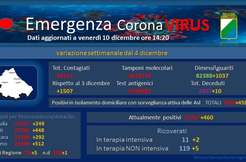 Del totale dei casi positivi, 270 sono residenti o domiciliati in provincia dell’Aquila (+2 rispetto a ieri), 859 in provincia di Chieti (+1 rispetto a ieri), 1638 in provincia di Pescara (+3 rispetto a ieri), 643 in provincia di Teramo (+1 rispetto a ieri), 27 fuori regione e 37 per i quali sono in corso verifiche sulla provenienza (+32 rispetto a ieri).