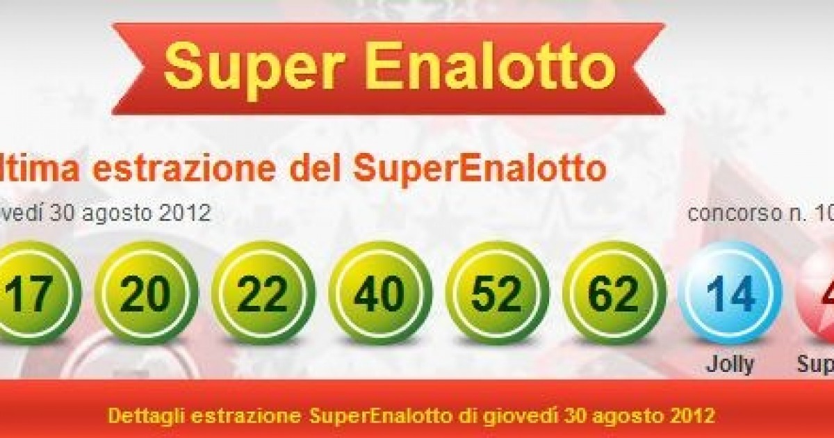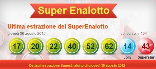 Superenalotto. Una giocata da 2 euro regala un sogno. Questa la sestina vincente: 17-20-22-40-52-62