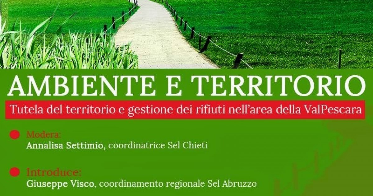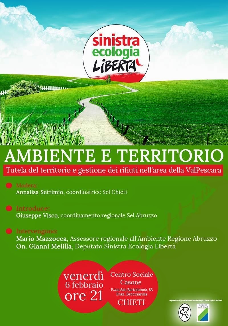 Di questo e altro si parlerà nell'incontro pubblico organizzato dal Gruppo Consiliare regionale di SEL che si terrà venerdì 6 febbraio alle ore 21 presso il Centro Sociale Casone, in Piazza San Bartolomeo 83 a Brecciarola. Parteciperanno Annalisa Settimio, coordinatrice del circolo di Chieti, Giuseppe Visco del coordinamento regionale di SEL, Mario Mazzocca, Assessore all'Ambiente della Regione Abruzzo, e l'On. Gianni Melilla, deputato di SEL.
