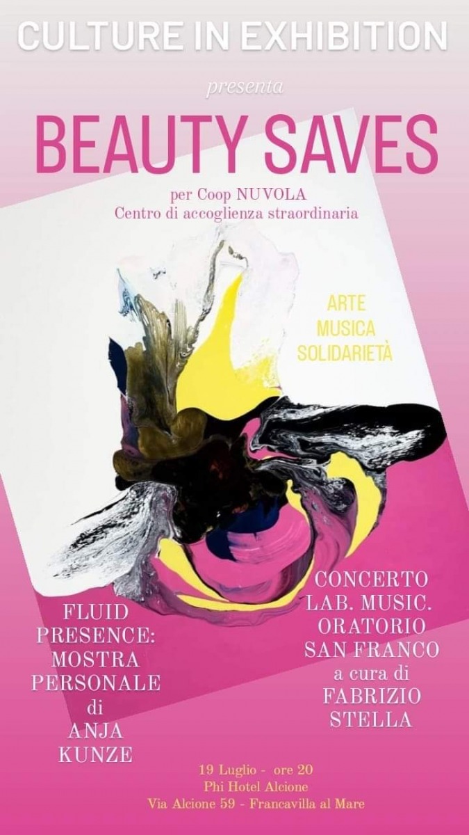 Dedicato alla solidarietà è l’appuntamento di mercoledì 19 luglio alle ore 20:00 per la rassegna Culture in Exhibition ideata da Anja Kunze, artista esclusiva dell’elegante PHI Hotel Alcione di Francavilla al Mare. L’evento presentato, Beauty Saves, è ideato in collaborazione col musicista Fabrizio Stella, che da anni rivolge gran parte del suo lavoro ai ragazzi in difficoltà, togliendone molti dalla strada e accomunandoli ad altri nel laboratorio musicale dell’Oratorio San Franco.