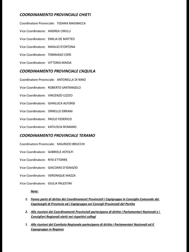 L'ORGANIGRAMMA E GLI INCARICHI. Di seguito il nuovo organigramma ed i relativi incarichi, suddivisi per provincia.