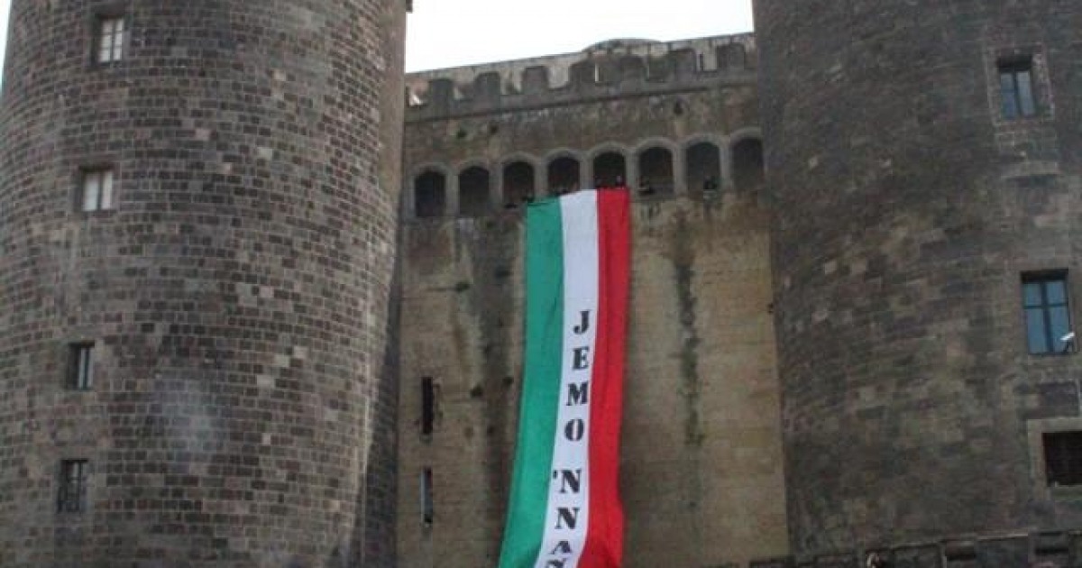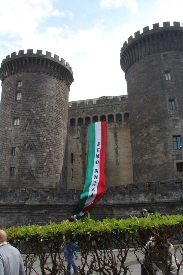 'JEMO 'NNANZI' VA A NAPOLI. Continuaano a protestare pacificamente gli attivisti del gruppo aquilano di "Jemo 'nnanzi" . Stavolta è toccato ad uno dei luoghi simboli di Napoli, il favoloso castello medioevale del Maschio Angioino, ospitare il celebre tricolore lungo 25 metri.