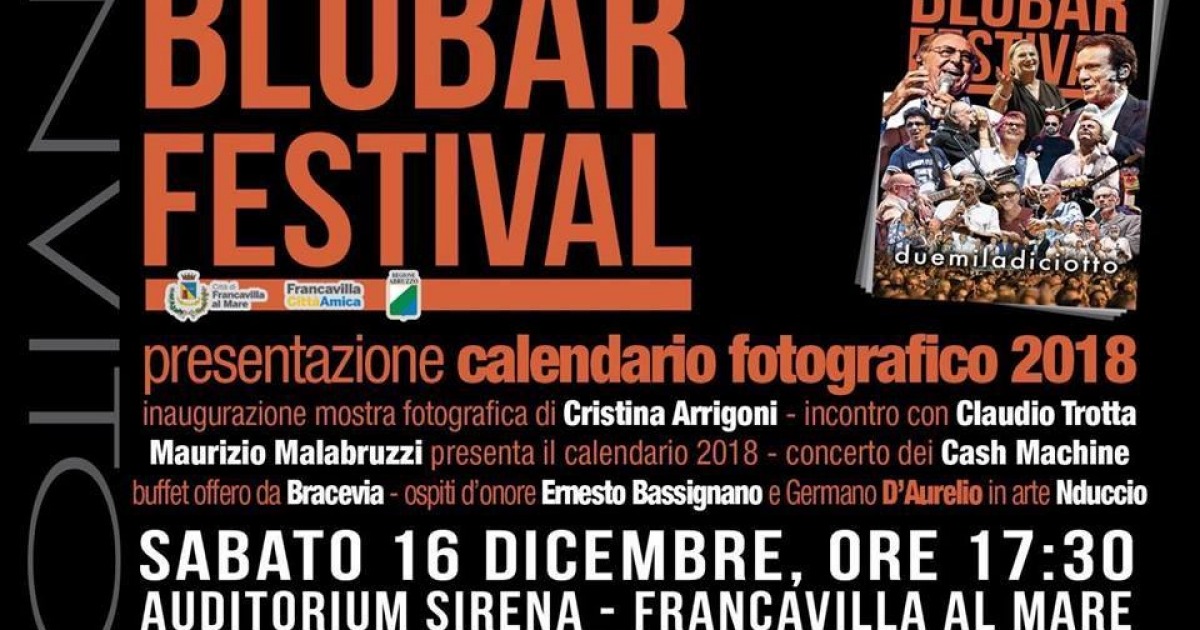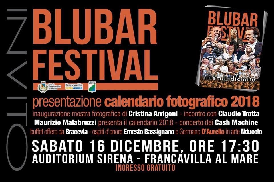 BLUBAR CALENDARIO 2018. Si terrà oggi 16 dicembre a Francavilla al Mare la presentazione del calendario fotografico 2018 del Blubar Festival. L'evento, che sarà a ingresso libero, si sposta quest'anno dal MuMi all'Auditorium Sirena, appena inaugurato in centro.