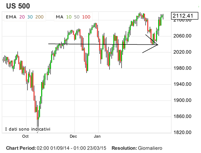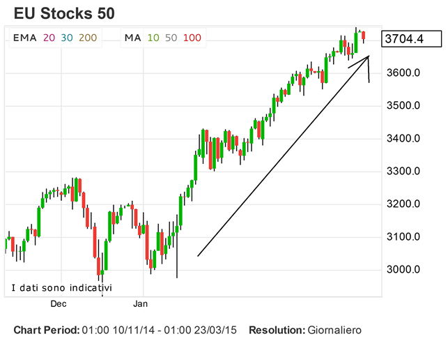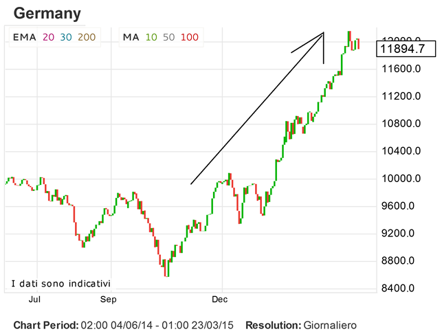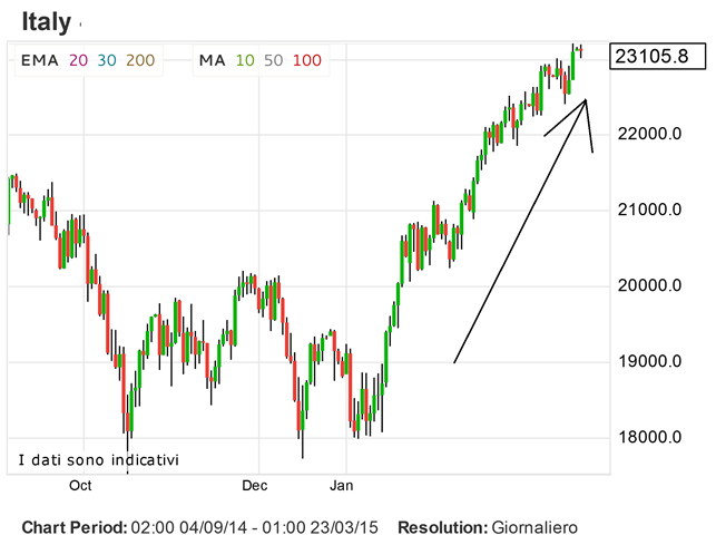 Le borse del vecchio continente hanno guardato con favore al QE e alle mosse di Draghi ; oltre che delle scelte della Bce hanno beneficiato di un forte ribasso del petrolio e del deprezzamento dell’euro. In America le operazioni di QE degli ultimi anni hanno contribuito al rialzo del mercato, ma anche a segnali positivi e di ripresa dell’economia reale. Penso che ciò non avverrà anche in Europa. Il movimento che mi aspettavo c’è stato ma non credo sia strutturale , la mia scommessa sull’Europa è per ora di tipo tattico e non strategico. Il rialzo che mi aspettavo per me è solo tecnico e dovuto ai motivi enunciati prima. Non credo che come in America, l’Europa ne beneficerà in termini reali e nel lungo periodo. In Europa credo che assisteremo ad una sorta di “giapponesizzazione” ; penso che al contrario dell’America dove i tassi sono visti al rialzo già a partire da quest’ anno, in Europa rimarranno bassi ancora a lungo. Chi ha investito prendendo spunto dal mio precedente articolo a circa 19000 punti di ftse mib è ampiamente in guadagno e può continuare, preservando il capitale con una stop a pareggio, a far correre i profitti. Il mio target di questo movimento sull’Italia è ancora più alto ma questo magari sarà oggetto del prossimo articolo.