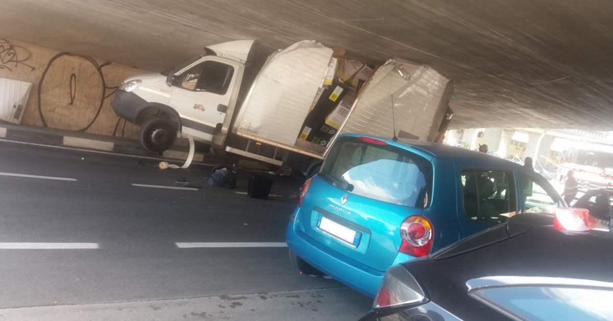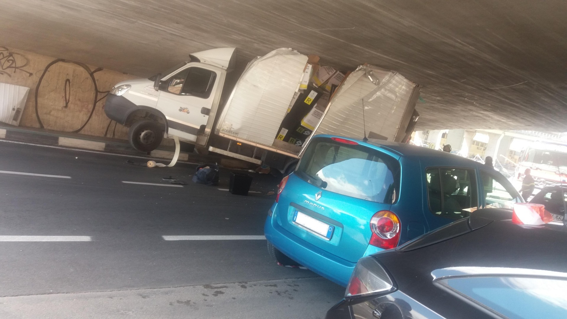 CAMION INCASTRATO SOTTO UN PONTE A PESCARA. Un camion che trasportava rifiuti sanitari pericolosi è rimasto incastrato stamane (foto Michele Raho) nel sottopasso del Ponte della Libertà lungo la strada che costeggia il fiume. L'autista, un giovane pescarese rimasto fortunatamente illeso, non ha calcolato l'altezza di circa due metri e così, passando sotto il ponte, è rimasto incastrato con la parte superiore del mezzo che si è inclinato. A terra sono finiti alcuni scatoloni con i rifiuti. Sul posto i vigili del fuoco e gli agenti della polizia municipale. Il tratto di strada interessato dall'incidente è stato chiuso al traffico. Disagi per gli automobilisti in transito sul lungofiume.