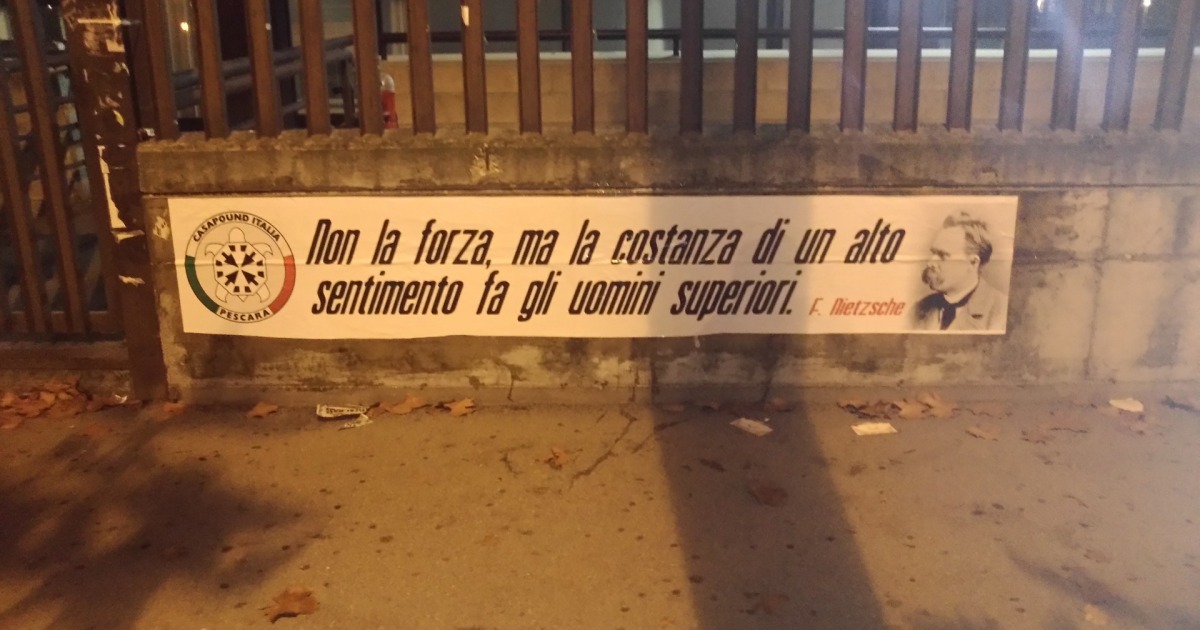 L'ANNIVERSARIO DELLA NASCITA DI NIETZSCHE. CasaPound Italia rende omaggio in Abruzzo al filosofo tedesco Friedrich Nietzsche nel centosettantesimo anniversario della sua nascita. Striscioni con citazioni dalle sue opere sono apparsi sui muri di L'Aquila, Pescara, Chieti, Avezzano, Lanciano, Sant'Egidio alla Vibrata e Sulmona. “Con questa azione – afferma CasaPound in una nota - abbiamo inteso omaggiare una delle massime figure della cultura europea. Con le sue opere Nietzsche diede il via ad un’autentica rivoluzione del pensiero, che a partire dagli inizi del Novecento andò a toccare tutti i campi dell’attività umana, dalla filosofia, all’arte, alla politica”.