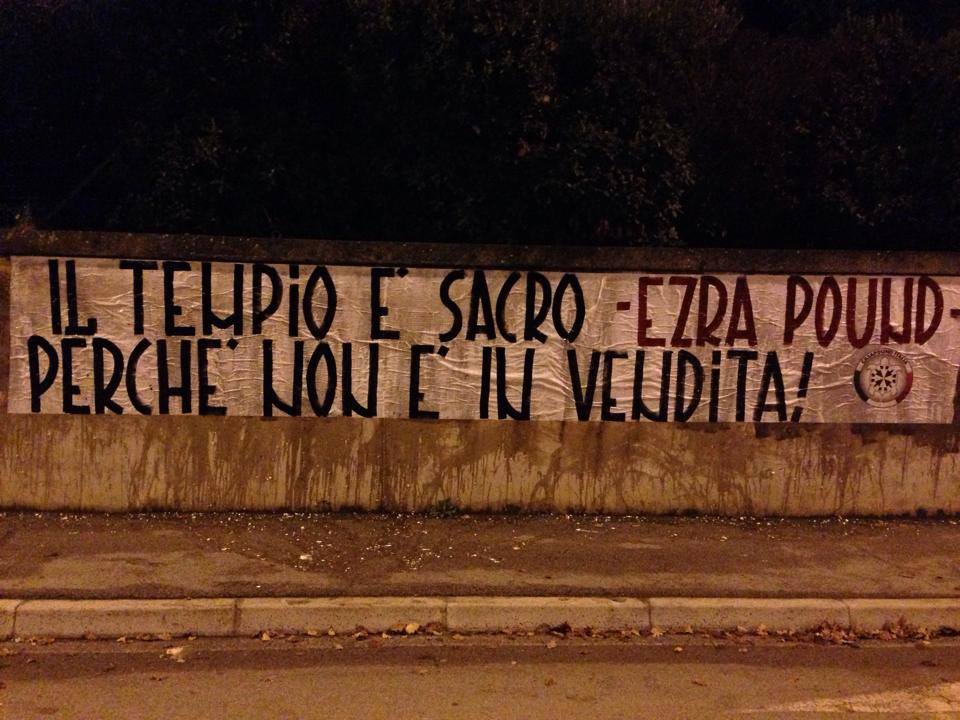 “Il tempio è sacro perché non è in vendita”: con questo verso dei Cantos, scritto in striscioni affissi in 50 città italiane, anche CasaPound Lanciano ha reso omaggio nella notte al poeta statunitense Ezra Pound, a cavallo tra il 128esimo anniversario della nascita e il 41esimo della morte.