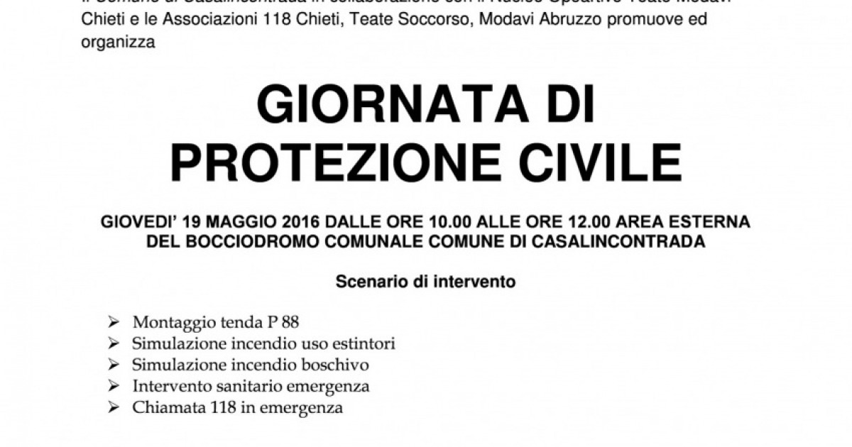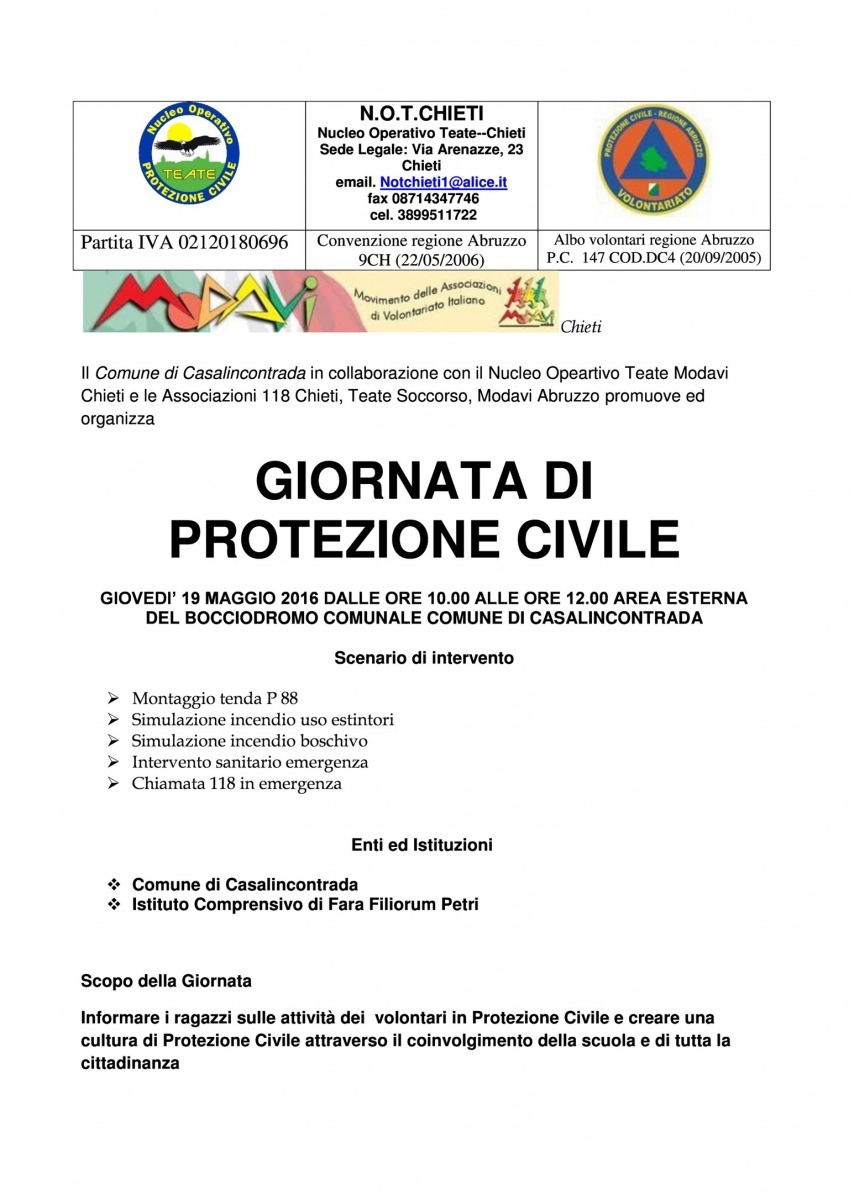 CASALINCONTRADA, PROTEZIONE CIVILE A SCUOLA. L'amministrazione di Casalincontrada insieme al Nucleo Operativo Protezione Civile di Chieti e in collaborazione con l'Istituto Comprensivo di Fara Filiorum Petri, organizza giovedì 19 maggio dalle 10 alle 12 presso l'area esterna del Bocciodromo comunale in Via Sandro Pertini 1, una mattinata dedicata alle attività generali della Protezione Civile.
