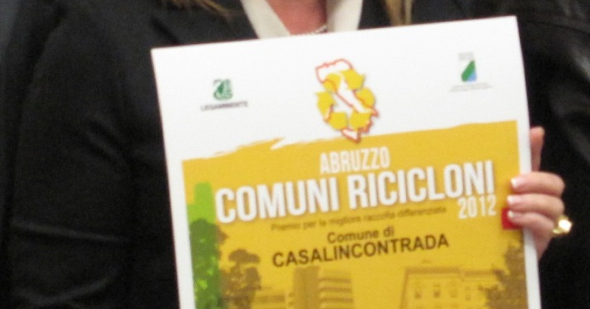 CASALINCONTRADA. "RICICLONE" D'ABRUZZO. Un premio alle amministrazioni comunali e ai cittadini che hanno ottenuto i migliori risultati nella gestione dei rifiuti. Con queste motivazioni, anche il Comune di Casalincontrada riceve il singolare riconoscimento nell’ambito della sesta edizione dell’iniziativa “Riciclabruzzo” promossa da Legambiente, meritando l’appellativo di Comune “Riciclone” d’Abruzzo. Il premio sarà consegnato al primo cittadino Concetta Di Luzio, domani nell’ambito del Workshop informativo su raccolta differenziata, indici di buona gestione e green economy, promosso da Regione Abruzzo e Legambiente, in programma a partire dalle ore 9.30 c/o la sala Convegni dell’Aeroporto d’Abruzzo. Dopo i saluti di apertura dell’Assessore regionale all’ambiente Mauro di Dalmazio, seguiranno le relazioni di esperti del settore e, quindi, la premiazione dei comuni “Ricicloni” d’Abruzzo. “Voglio esprimere il mio ringraziamento alla popolazione casalese – ha sensibilmente sottolineato il sindaco di Casalincontrada Concetta Di Luzio - perché questo significativo premio è il risultato non solo della politica portata avanti dalla nostra amministrazione comunale, ma soprattutto del comportamento responsabile e coerente dei cittadini, adottato nell’effettuare la raccolta differenziata”.