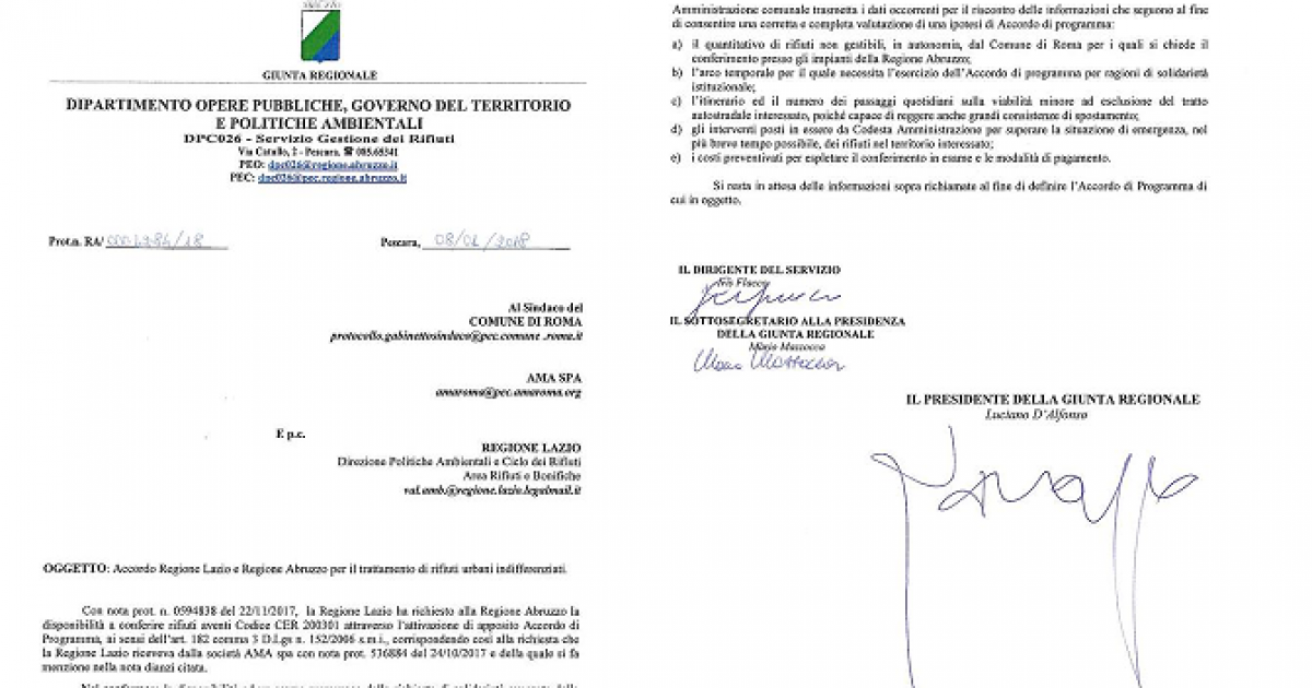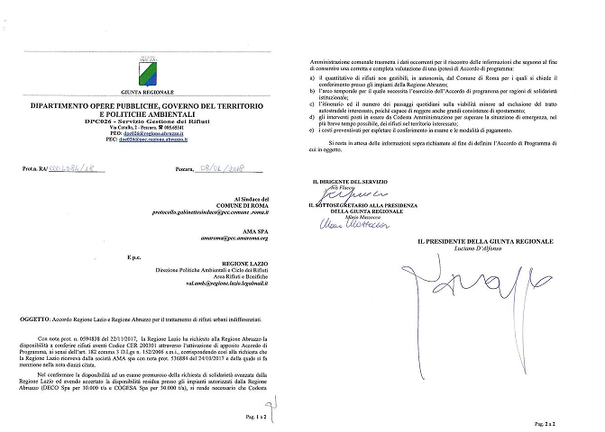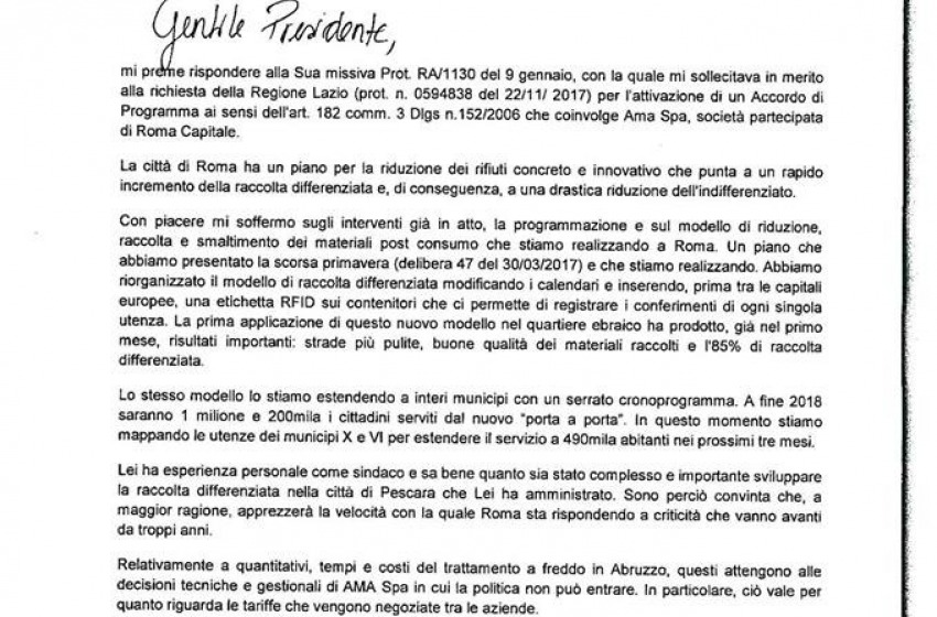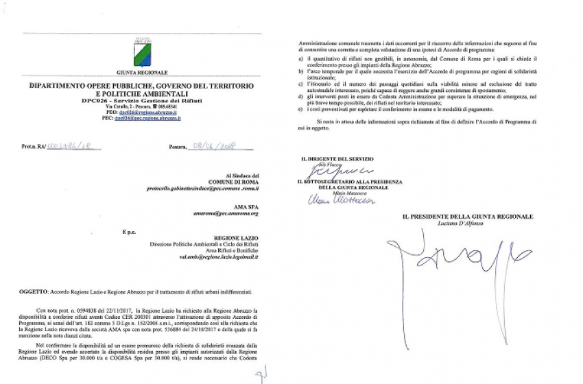 D'ALFONSO SCRIVE ALLA RAGGI: "ABRUZZO DISPONIBILE AD AIUTARE MA VOGLIAMO CONOSCERE LA SITUAZIONE". Il governatore della Regione Abruzzo Luciano D'Alfonso ha scritto una lettera a Virginia Raggi, all’AMA e alla Regione Lazio manifestando la disponibilità ad aiutare la Capitale d'Italia nella risoluzione della questione dei rifiuti. Ma, come è facilmente intuibile dalla lettura del testo della missiva, a determinate condizioni, la stessa gestione dei rifiuti abruzzesi negli impianti e discariche della nostra regione. Infatti, sono stati offerti nell'ambito di un possibile Accordo di Programma le disponibilità residue presso gli impianti autorizzati dalla Regione Abruzzo (Deco spa 30.000 t/a e Cogesa 30.000 t/a).