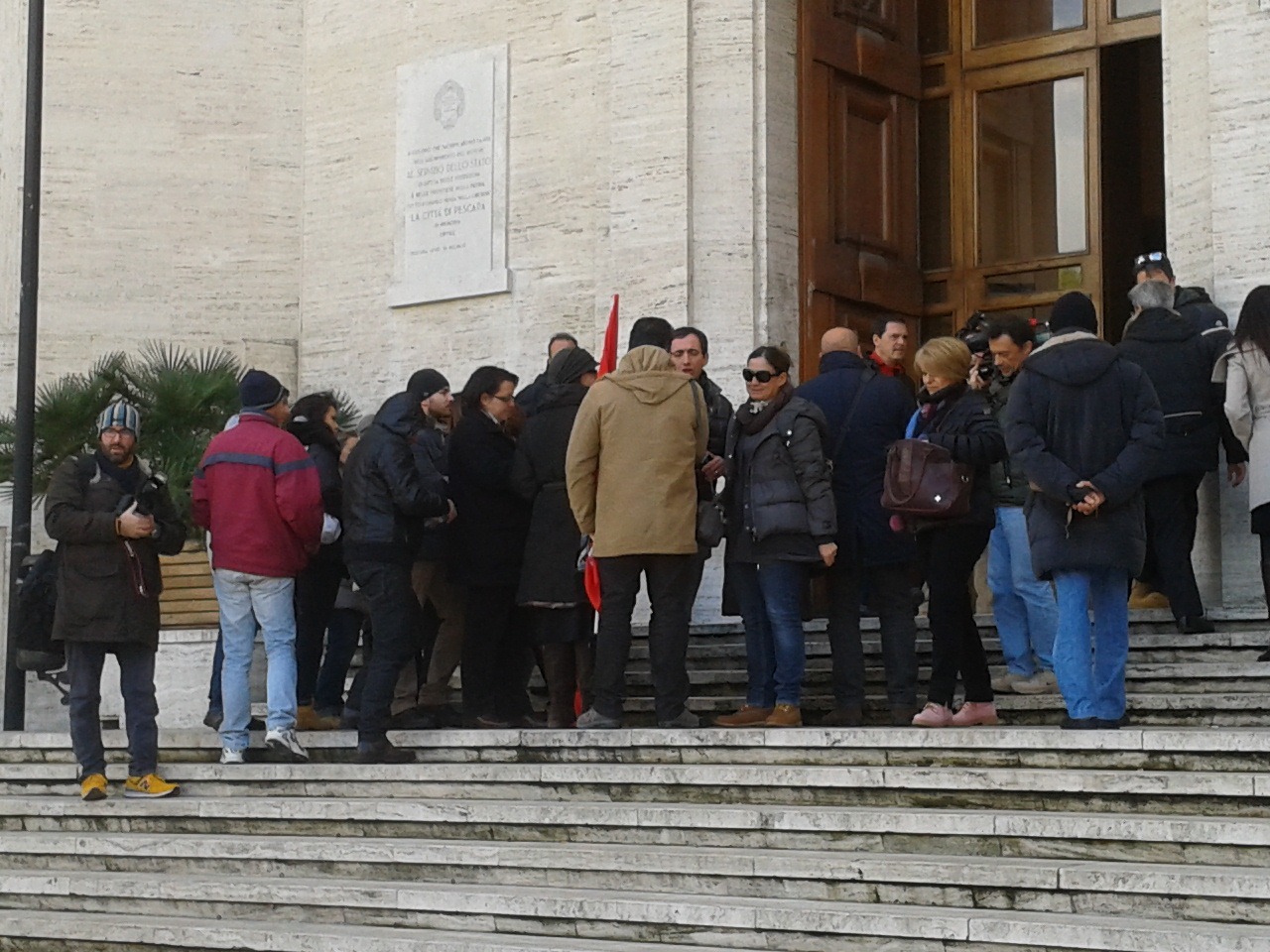 PESCARA. PROTESTA DEI DIPENDENTI DELLA TERAMO LAVORO. La storia è nota. Il 31 dicembre 2012 la Teramo Lavoro, società in house della provincia di Teramo, ha cessato le attività per mancanza di fondi. Questa mattina, a Pescara, i 110 dipendenti hanno manifestato davanti alla sede del Comune dove era previsto l'arrivo del presidente delle Regione Gianni Chiodi.