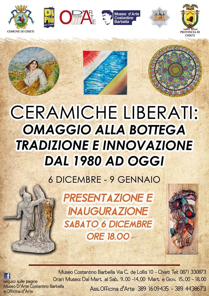 CERAMICHE LIBERATI IN MOSTRA A CHIETI. Il Museo D'Arte Costantino Barbella, in collaborazione con l'associazione Officina D'Arte, il Comune di Chieti, la Fondazione Caricheti e la Provincia di Chieti, presenta la Mostra d'Arte "Ceramiche Liberati. Omaggio alla Bottega. Tradizione e innovazione. Dal 1980 ad oggi", che si terrà dal 6 dicembre 2014 al 9 gennaio 2015.