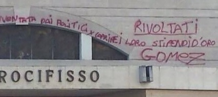 CHIETI E LA CACCIA A GOMEZ. “Rivoltati. Crisi uguale a parola inventata dai politici per coprire i loro stipendi d'oro. Gomez”. E' questa la misteriosa firma del writer, o vandalo per la maggioranza dei teatini, apparsa la scorsa notte sulla porta d'ingresso della chiesa Santissimo Crocifisso nel popoloso quartiere di Chieti Scalo. Ma chi è questo Gomez? Perchè ha imbrattato e vomitato anche all'interno di un luogo sacro come l'asilo nido di via Amitrana? Non è la prima volta che la cittadinanza teatina si trova a fare i conti con l'autore di queste scritte e che le forze dell'ordine stanno cercando alacremente. Ha agito da solo? Un testimone ascoltato dai carabinieri avrebbe riferito di avere visto alcuni ragazzi nei pressi della scuola intorno alle 3 del mattino di mercoledì. Si stanno analizzando i tabulati telefonici ed alcune immagini estrapolate dalle telecamere di videosorveglianza di un edificio vicino all'asilo devastato solo pochi giorni dopo la sua inaugurazione. Ma per il momento non ci sono sviluppi sul gesto che l'assessore Colantonio sulla sua bacheca facebook non ha esitato a definire "da bastardi". A chiedere giustizia, poi, ci sono anche i genitori dei piccoli ospiti dell'istituto, ancora chiuso, ed alle prese con gli enormi disagi provocati da Gomez e compagni.