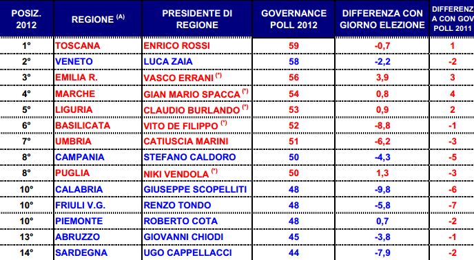 E IL "GOVERNATOR" GIANNI CHIODI? Nel sondaggio "Governace Poll" è compresa anche la classifica del Primi cittadini delle venti regioni dell'Italia. In testa c'è Enrico Rossi, presidente della Toscana, seguito da Luca Zaia (Veneto) e Vasco Errani dell'Emilia Romagna. Dietro il trio di testa c'è il presidente delle Marche, Gian Mario Spacca e immediatamente dietro Claudio Burlando (Liguria). Al penultimo posto c'è l'Abruzzo di Gianni Chiodi. Il "Governator", nonostante gli sbandieratissimi successi nel comparto sanità, occupa la 13° posizione davanti al "collega" Pdl Ugo Vappellacci della Sardegna. Che sia colpa della disoccupazione dilagante, della desertificazione industriale ovvero del fatto che il "piano di rietro" del debito della sanità era stato sottoscritto dalla precedente Giunta Del Turco?