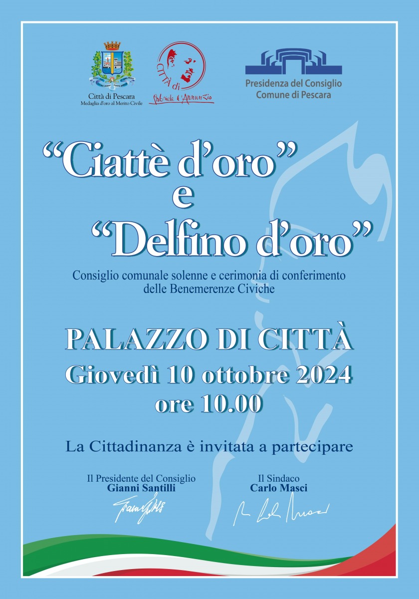 "I riconoscimenti del Comune sono i riconoscimenti della città intera – commenta il Sindaco Carlo Masci - a chi si è distinto o si distingue nei campi più svariati, portando in alto il nome di Pescara, ben oltre i confini geografici. Sono orgoglioso di consegnare ancora una volta il “Ciattè d’oro”, il “Delfino d’oro” e le "Menzioni" a chi ama Pescara. I premiati, quelli passati, quelli di quest'anno e quelli futuri, rappresentano, in realtà, una piccola flotta, ben più consistente, composta da tutte quelle persone che idealmente dovrebbero ricevere questo riconoscimento perché si distinguono, con impegno e dedizione, ma lontano dai riflettori. A tutti va il mio grazie per ciò che fate".