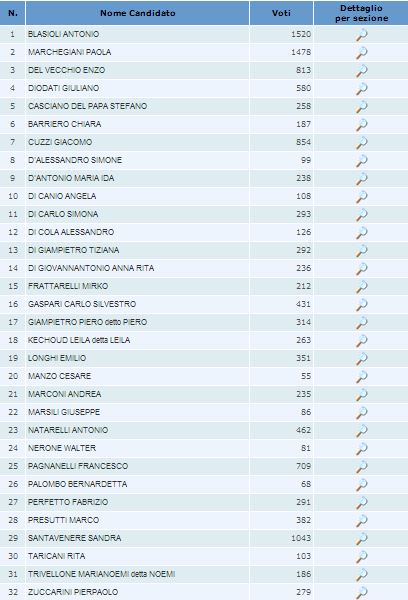Il più votato è Antonio Blasioli (1.520) preferenze poi Paola Marchegiani (1.478). Bene Santavenere (1.043) e Del Vecchio (813)