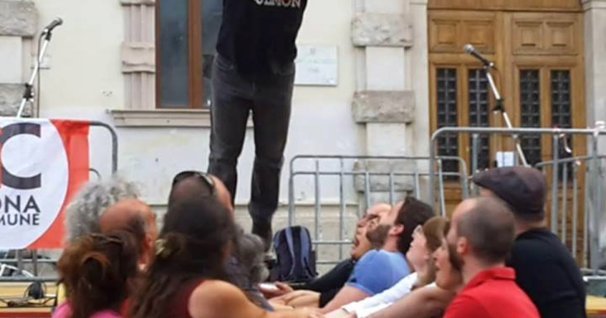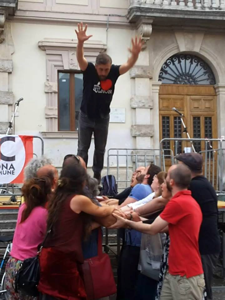 Il leader di Sbic si ripresenta alle amministrative per correre come sindaco con la sua lista civica e, a un comizio, si getta sugli elettori a mo' di rockstar!!!