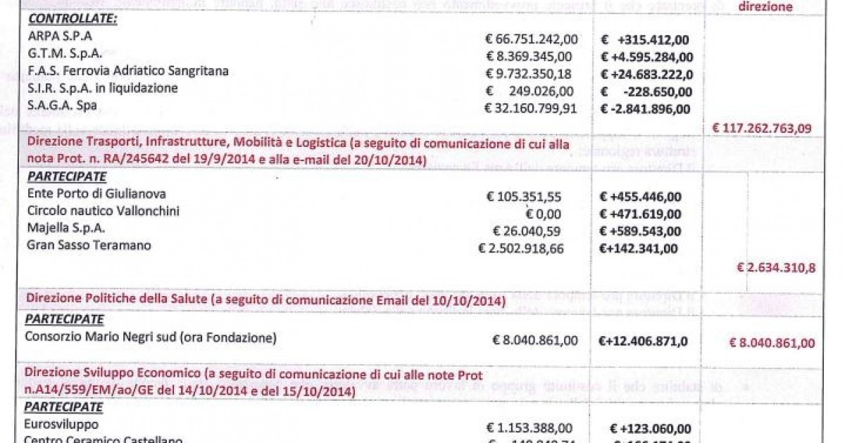 Le società partecipate più "care" sono Arpa, Gtm, Sangritana, Fira, Cotir, Abruzzo Engineering e Mario Negri Sud