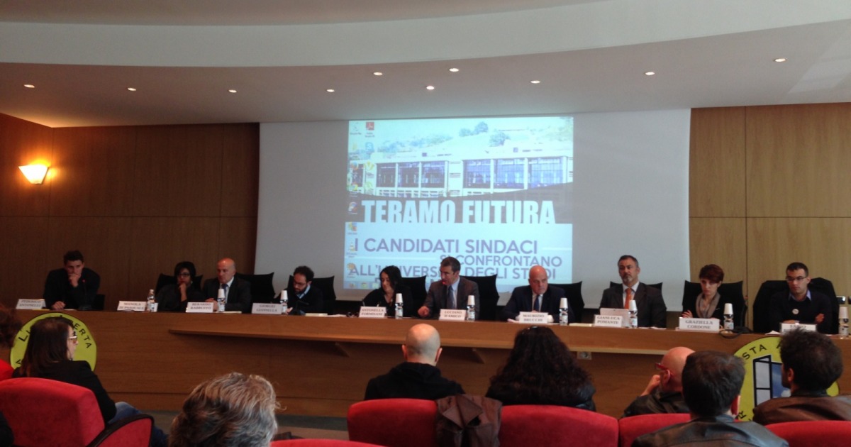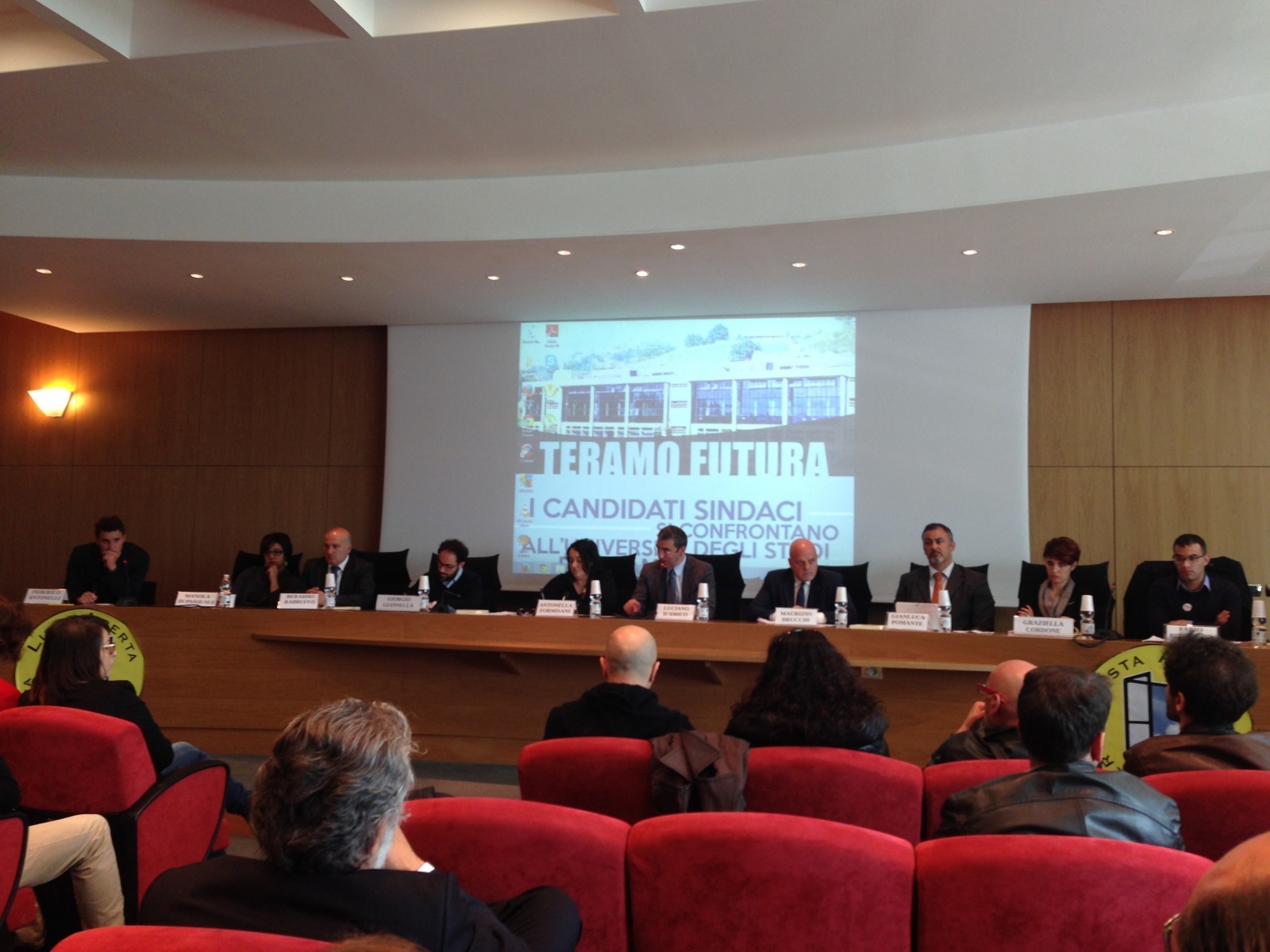DIBATTITO ALL'UNIVERSITA' DI TERAMO COI CANDIDATI SINDACI. Nella la sala tesi dell'Università degli Studi di Teramo, il confronto tra i candidati per la poltrona di Sindaco di Teramo. L'evento, moderato dalla giornalista Antonella Formisani, ha visto Manola Di Pasquale, Berardo Rabbuffo, Giorgio Giannella, Maurizio Brucchi, Gianluca Pomante, Graziella Cordone e Fabio Berardini confrontarsi su domande ideate proprio dagli studenti, che dell'incontro si sono fatti promotori tramite l'associazione Teramo Futura.
