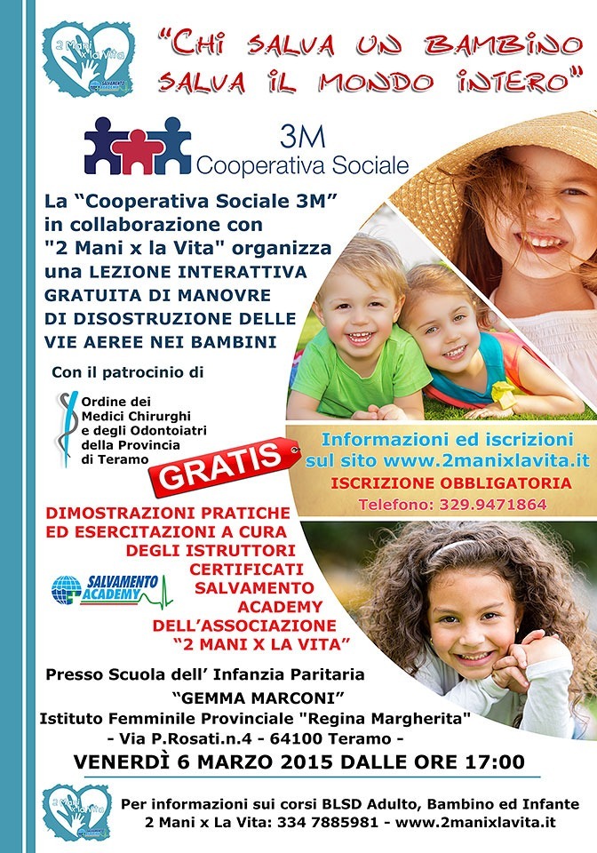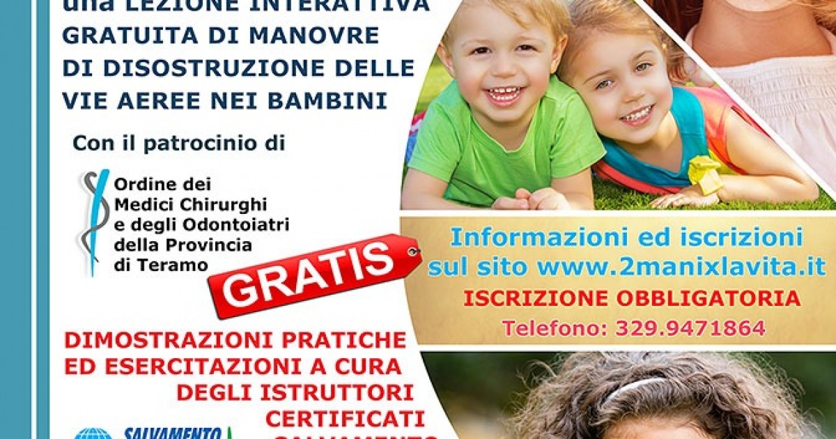 UN CORSO IMPORTANTE A TERAMO. Venerdì 6 marzo a Teramo, presso la scuola dell'Infanzia Gemma Marconi alle ore 17, ci sarà un evento gratuito di Manovre di Disostruzione delle vie aree nei bambini e negli infanti, intitolato "Chi salva un bambino salva il mondo intero".